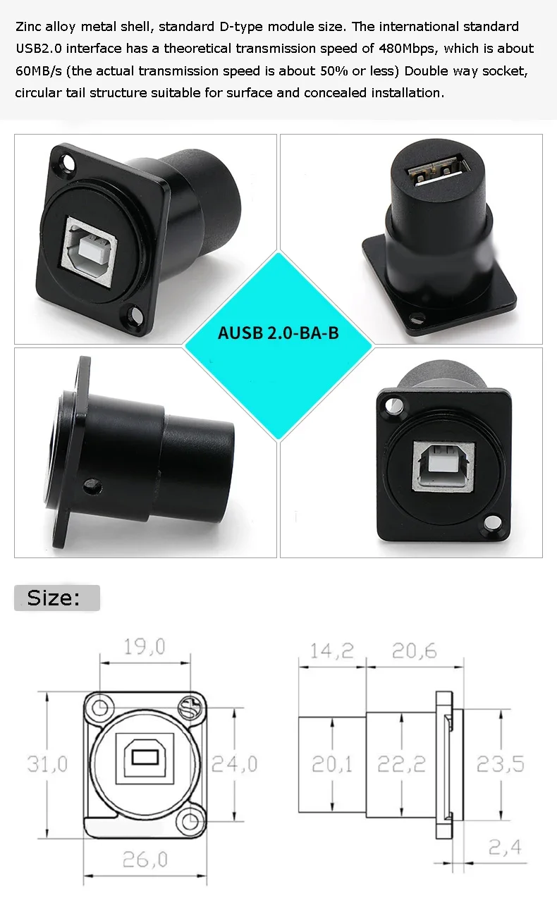 D type Welding free Female to Female Metal Socket Jacks USB3.0 USB2.0 USB Type B Connector Data Adapter Panel Mounting+ Dust Cap