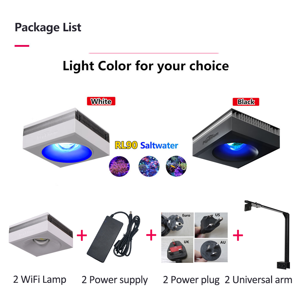 △△△PopBloom RL90 WiFi Reef LED: Years of research and testing are behind Turing smart reef lighting system. The RL90 light has built-in wi-fi, you can create groups for linkage control multiple lights. RL90 is reef-spectrum, 4 channels of white, blue, purple UV, cyan blue leds provides a reef coral-safe range of color temperatures that enable all corals to flourish. Designed to ensure optimal coral growth for SPS/LPS.