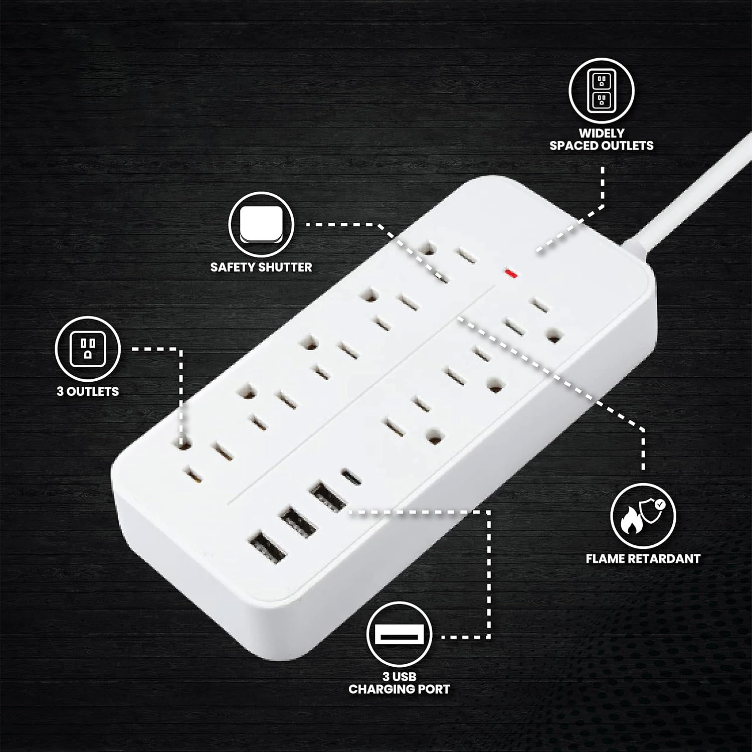 【Safety and Certificate】- ETL safety certified, with extension cord and other major components certified by UL. The over current protection switch limits the power strip's working current to certain setting, so it will not get hot during usage. Environmental protection and fire-resistance PC shell with flame retardant at 1382℉ makes it more durable and longer lifetime.