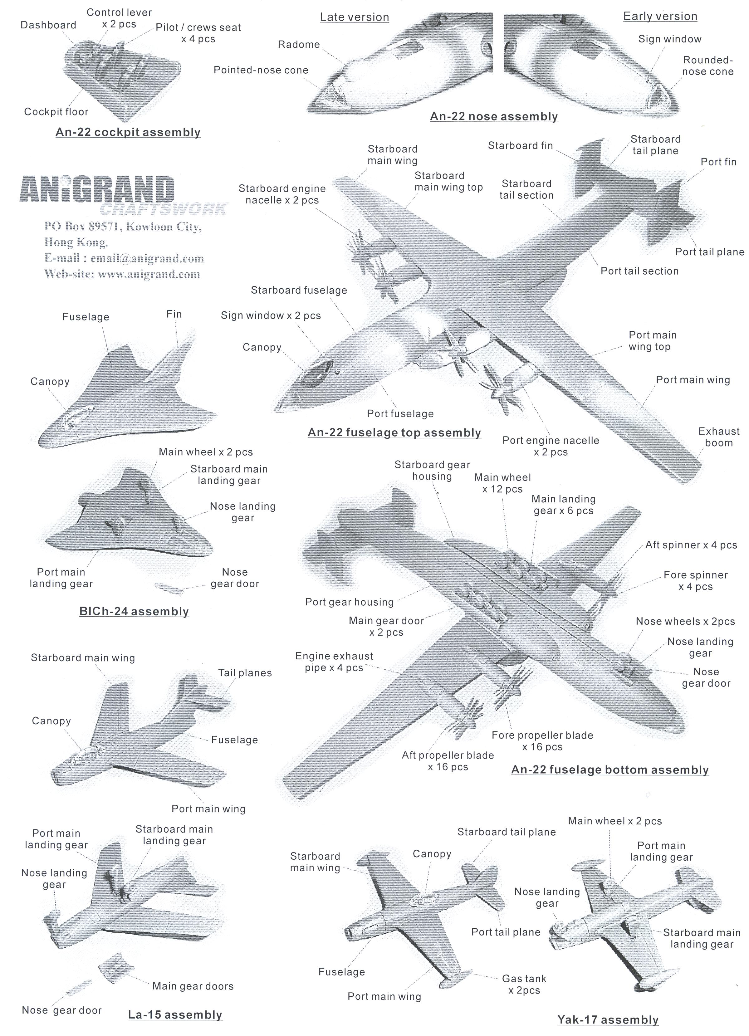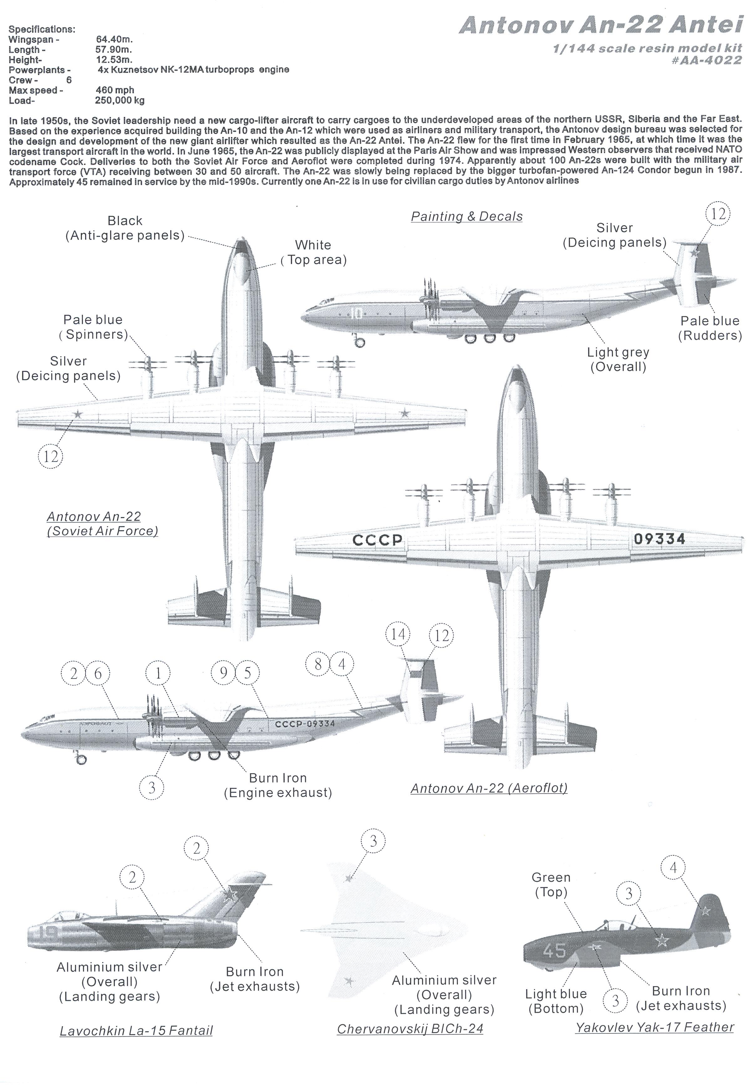 This kit contains the Antonov kit, PLUS models of 3 SECRET SOVIET AIRCRAFT! The Secret aircraft are the Lavochkin La-15 Fantail, Chervanovskij BlCh-24, and the Yakovlev Yak-17 Feather.