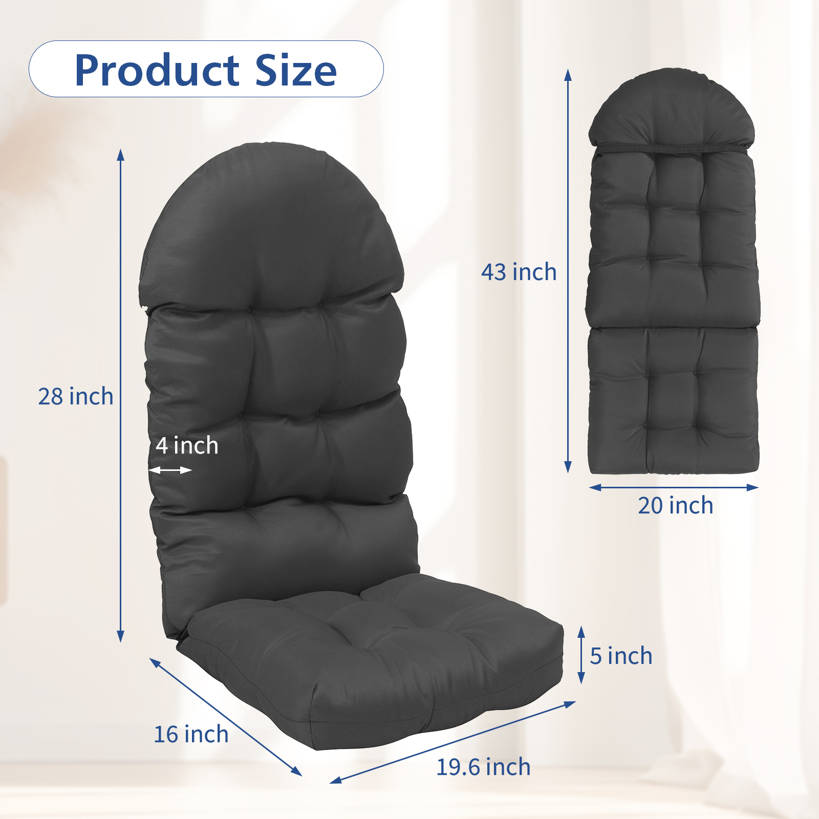 Size: Seat size: 15.7" x 19.75" x 4" deep Back size: 28" x 19.75" x 5"