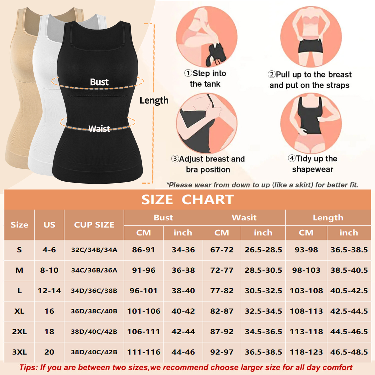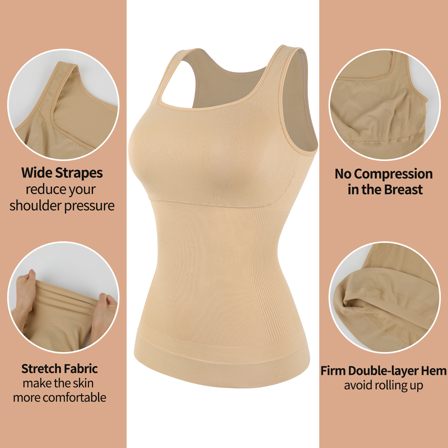 NO COMPRESSION IN BUST AREA: The control of the shapewear tops starts from the area below the bust. this design offers support but do not compress your chest area much. You can wear it with or without a bra. Wide straps hide your bra straps. Double-layer strengthened hem avoid rolling up.