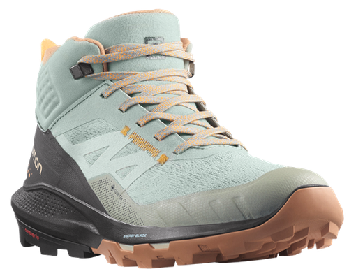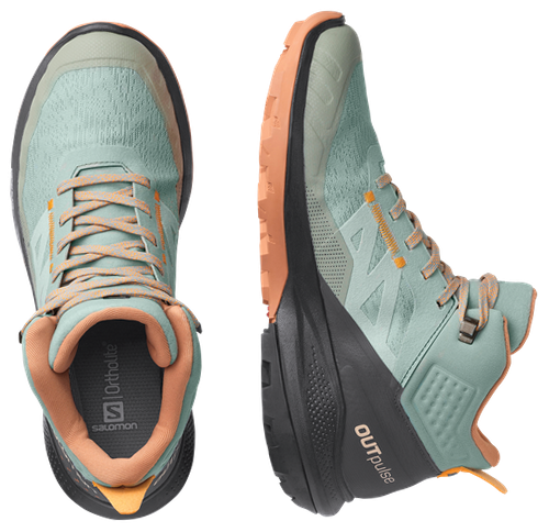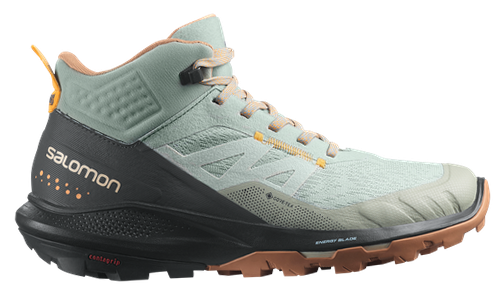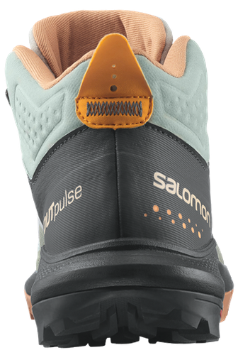 As adaptable as they are dependable, the fully-charged Salomon Outpulse Mid GORE-TEX Hiking Boots for women offer the grippy propulsion you want to charge into outdoor adventures. A cushioning, comfortable hiking design built around Salomon's soft fuzeFOAM midsole, the Outpulse Mid utilizes Reverse Camber rocker geometry for smooth transitions on every step you take. Water-resistant, welded uppers made of durable recycled synthetic materials feature protective toe caps up front and a mid-height design for superior ankle support. Inside the Outpulse Mid, soft and breathable textile linings and GORE-TEX waterproof/breathable membranes surround the feet with breathable, 100% waterproof comfort. Soft Fuze Foam EVA midsoles to give hikers stable, supportive cushioning over demanding terrains. The midsoles also feature a lightweight integrated energyBLADE TPU plate to help filter the ground and deliver a smooth, dynamic stride. Built to take on all surfaces, the versatile All Terrain Contagrip outsoles deliver durability and traction over wet, dry, hard, or loose surfaces. Avg. Ht: 4.6". Avg. Wt.: 11.5 oz. Imported.