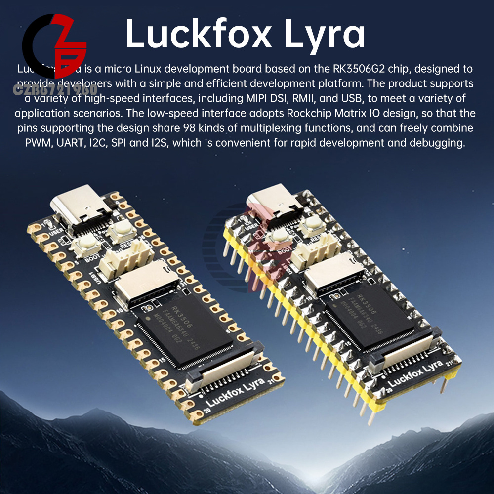 Luckfox Lyra is a miniature Linux development board based on Rexchip RK3506G2 chip, aiming to provide developers with a simple and efficient development platform. It supports a variety of high-speed interfaces, including MIPI DSI, RMII, and USB, etc., which can fulfill various application scenarios. The low-speed interface adopts Rockchip Matrix IO design, which enables the pins supporting this design to share 98 kinds of multiplexing functions, and can be freely combined with PWM, UART, I2C, SPI and I2S, etc., which is convenient for rapid development and debugging.