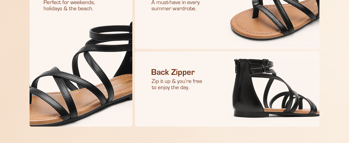 Comfortable Flats: No-heel gladiator style for all-day ease.