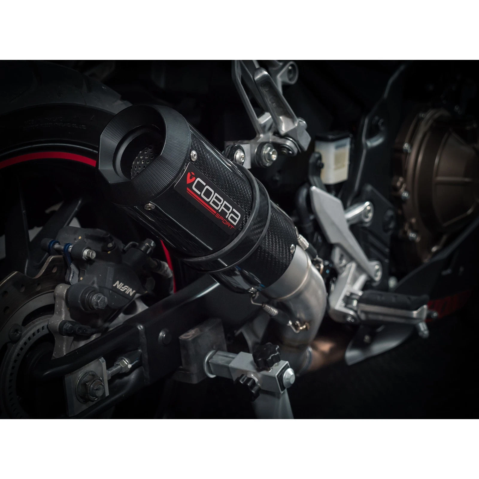 The Cobra Sport GP Carbon end can supplies an even further reduction in weight and enhanced soundtrack that runs safely under track-day noise limits presenting the stealthiest option for your CB500F.