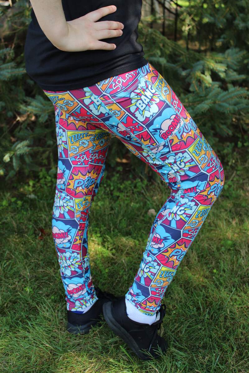Put a boost in your morning walk or exercise routine with our colorful comic book leggings! Yoga style waistband with matching stitching and pockets big enough for your phone!