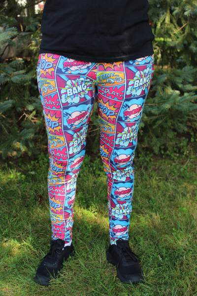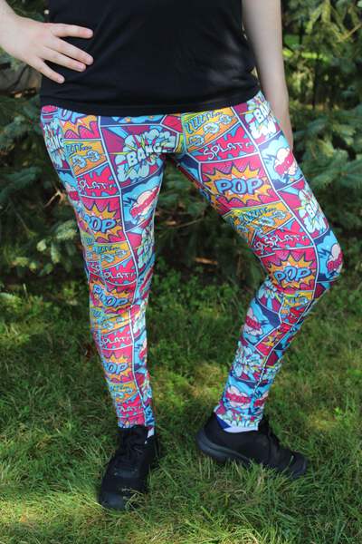 Put a boost in your morning walk or exercise routine with our colorful comic book plus size leggings! Yoga style waistband with matching stitching and pockets big enough for your phone!