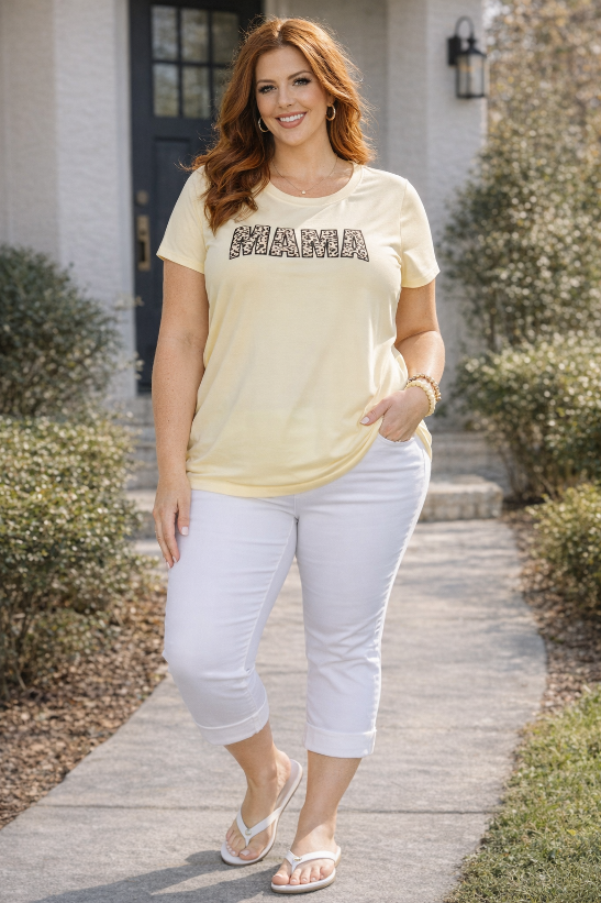 The Leopard Mama Tee in Banana is the perfect addition to your wardrobe! Super soft and comfortable, this trendy tee is made of a buttery-smooth blend of polyester, rayon, and spandex, with a playful leopard design for extra flair! Stylish, fashionable, and oh-so-cute! Mama never looked so good!