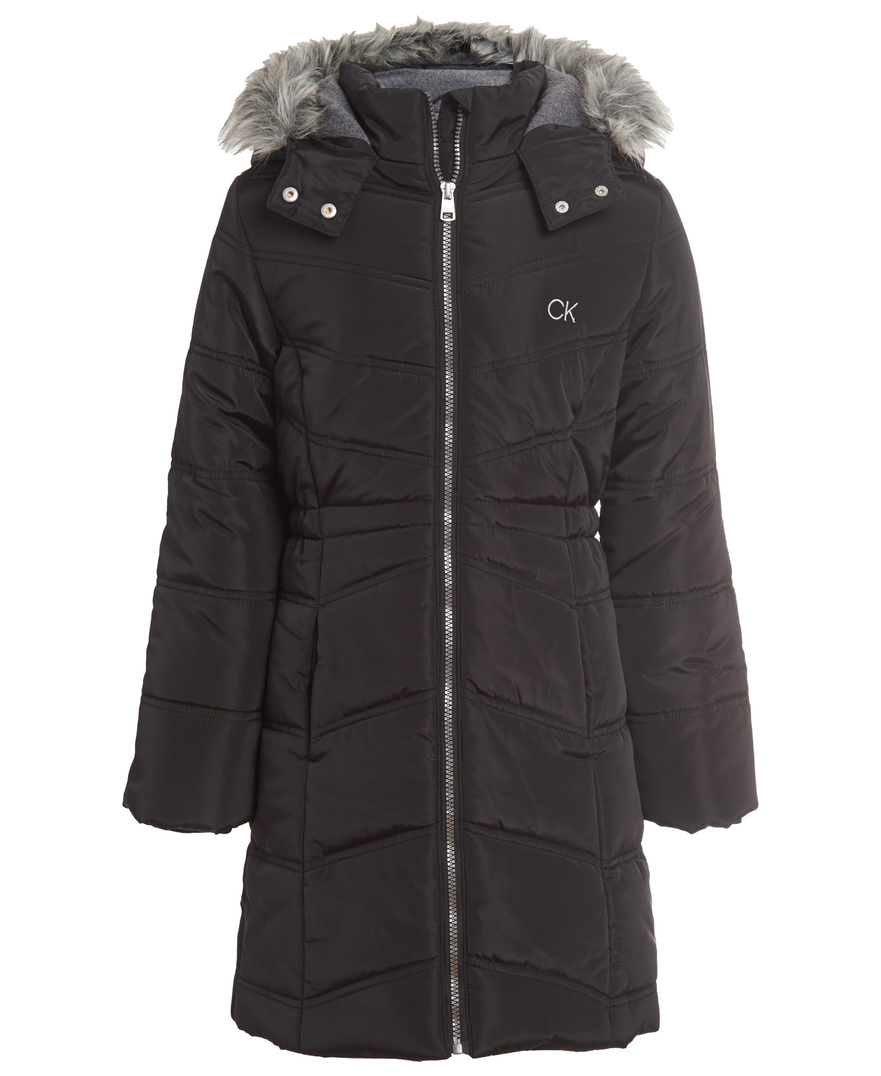 Keep her wrapped in warmth in this silky puffer jacket from Calvin Klein, featuring a softly quilted design and faux fur trimmed hood, with a fleece interior to guarantee her cozy comfort in cold weather.
