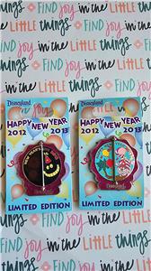 This limited edition pin features Cheshire Cat, from Alice in Wonderland, celebrating the New Year. The New Years Eve 2012 side features the Cheshire Cat's eyes, smile, and party hat with fireworks and a black background. The Happy New Year 2013 side features the Cheshire Cat sitting on a tree branch celebrating the new year with balloons, confetti, and a party hat. The pin has a pink border and has the Disneyland Resort logo at the bottom.
