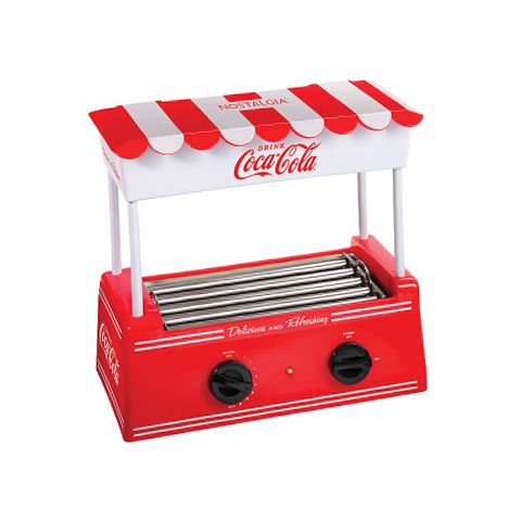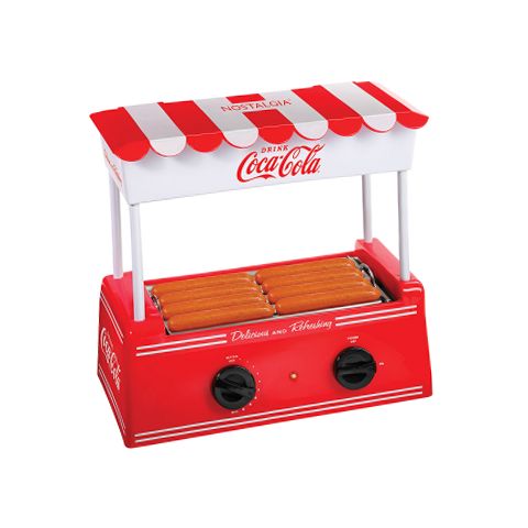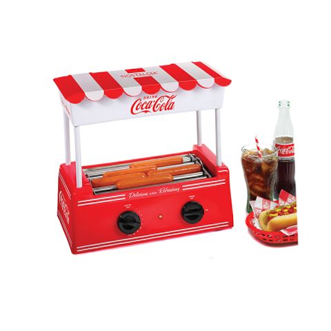 Keep the good times and hot dogs rolling! Cooks eight regular-sized or four-foot-long hot dogs at a time. The stainless-steel rollers continuously rotate to evenly cook hot dogs, while the adjustable heat settings makes cooking hot dogs simple and quick. The stylish canopy doubles as a bun warmer, holding up to 6 buns at a time. Perfect for taking snack time or mealtime to the next level. Live on the Coke side of life!