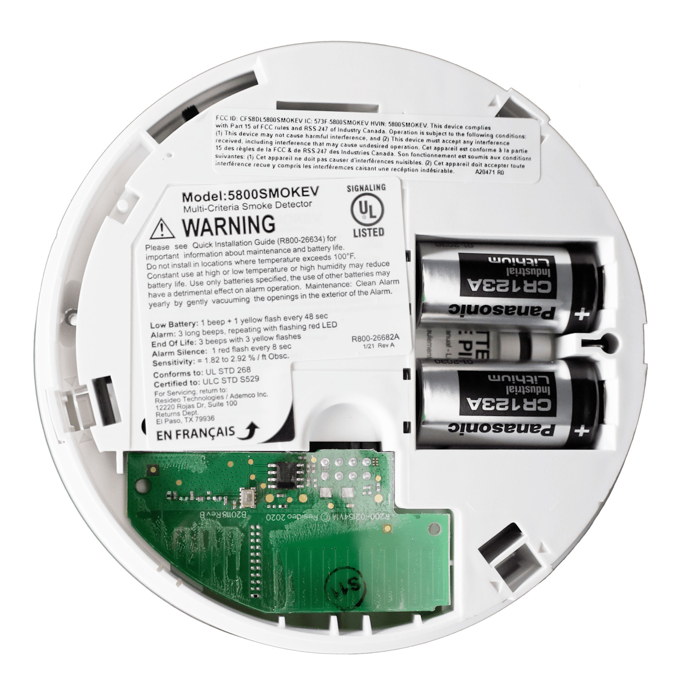 The 5800SMOKEV has a sleek, redesigned exterior, with a smaller form factor. It manages to have a smaller footprint than its predecessors while still maintaining its ability to detect the presence of smoke, heat, and freeze conditions. It has a nominal transmitting range of 200' and is intended only for indoor use.