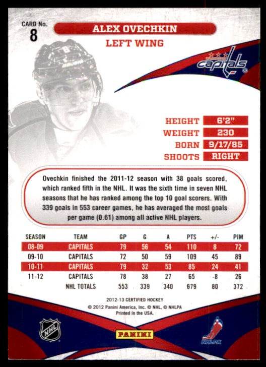 | Description: | Alex Ovechkin | | Category: | Hockey | | Year: | 2013 | | Product: | Panini Certified | | Team: | Washington Capitals | | Card Number: | 8 | | Dimensions: | 2¼" x 1½" |