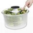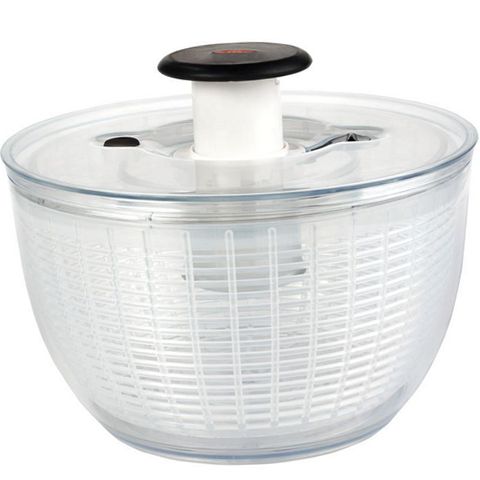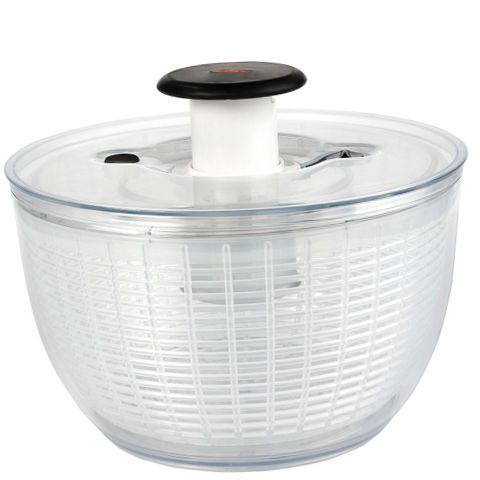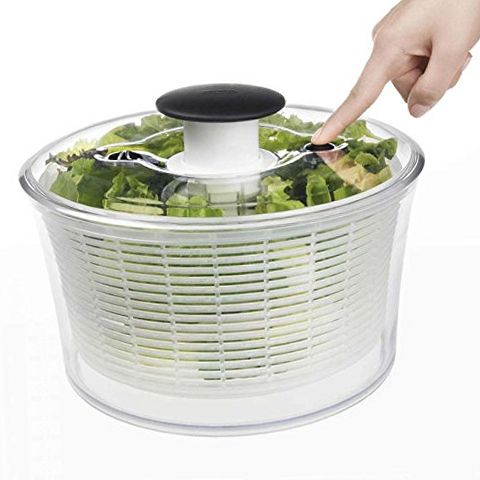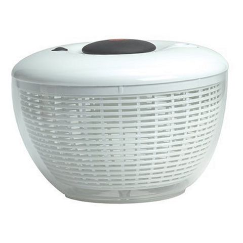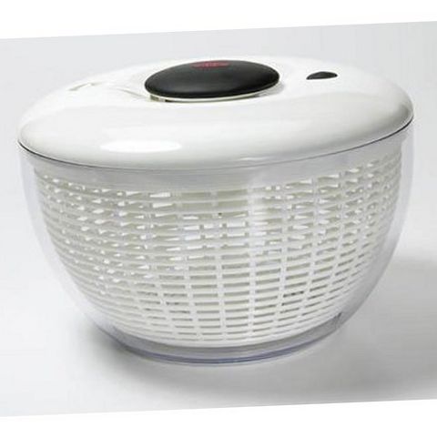 For easy salad preparation, try the SoftWorks Salad Spinner. Simply press the soft, non-slip knob to start the basket spinning. Washing and drying leafy vegetables has never been simpler or more fun than with this gadget. One hand is all you need to press the soft, cushioned knob to start the spinning; when the built-in brake is applied and the job is done, the basket and bowl can be taken apart and used separately. The knob locks down for easy storage, and the spinner is dishwasher-safe. Use this tool with lettuce, raw spinach, broad-leafed herbs, and greens--they end up clean and oh-so-dry, and the drier your leaves, the better salad dressings will adhere.
