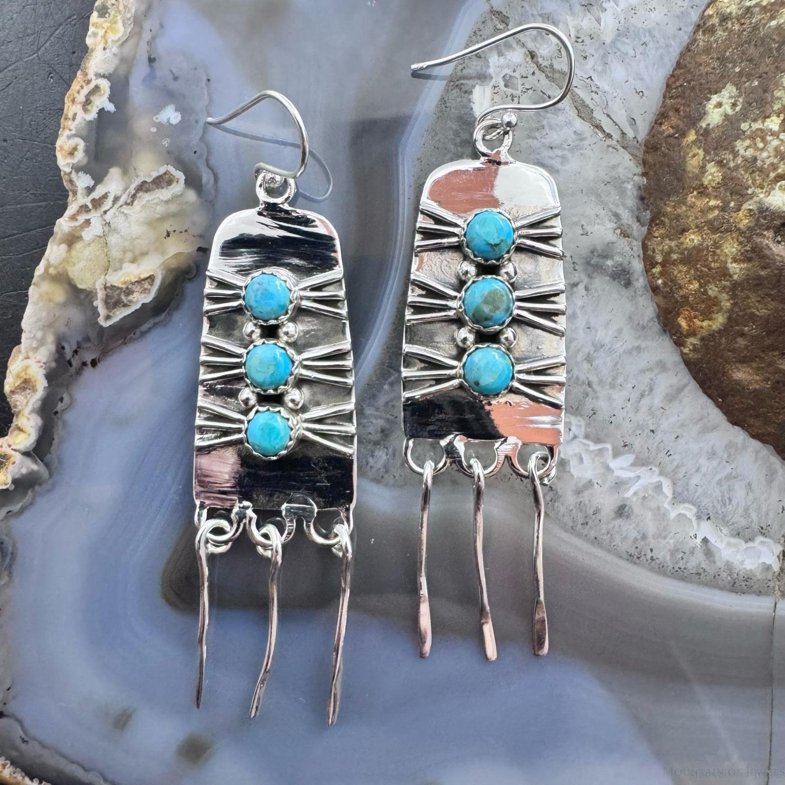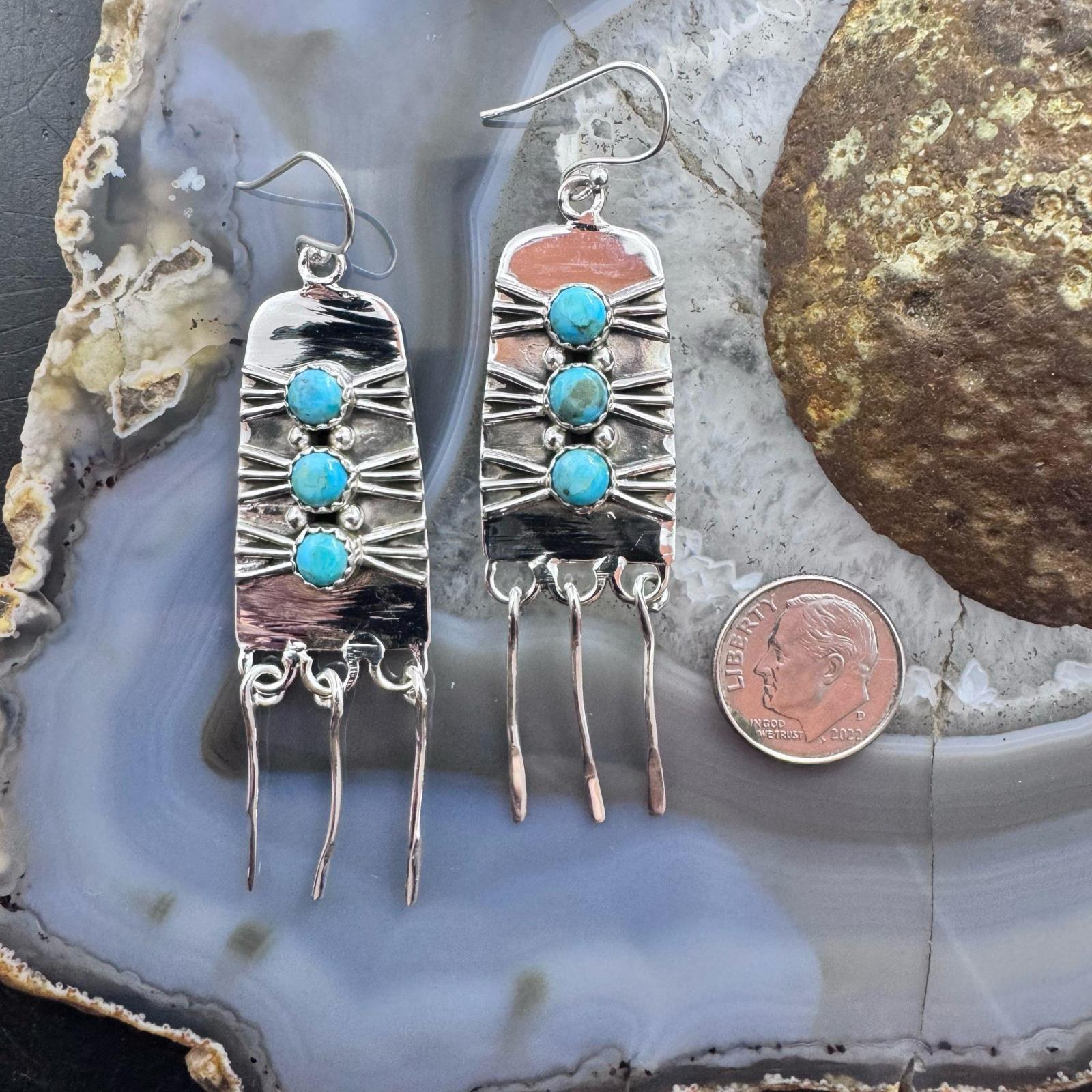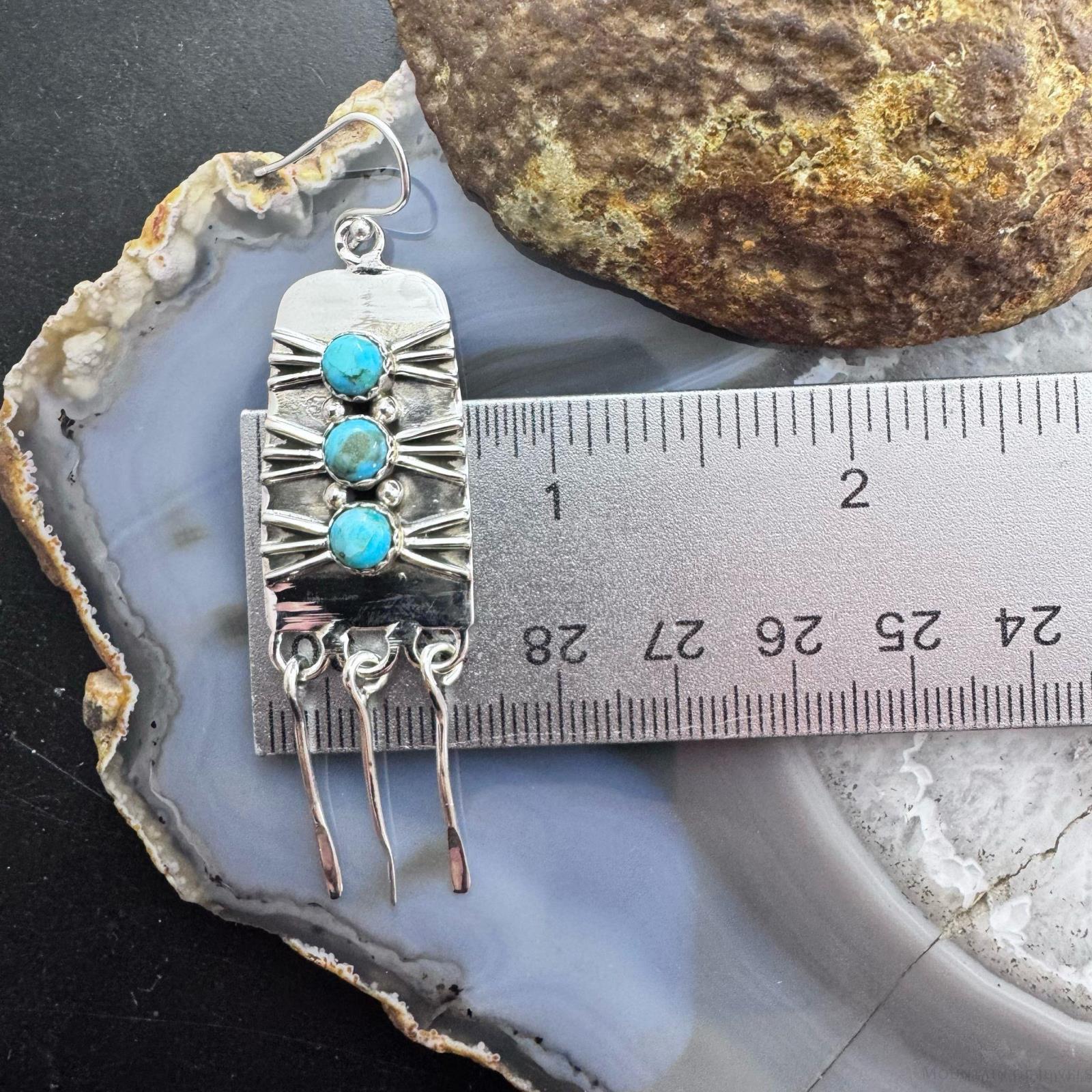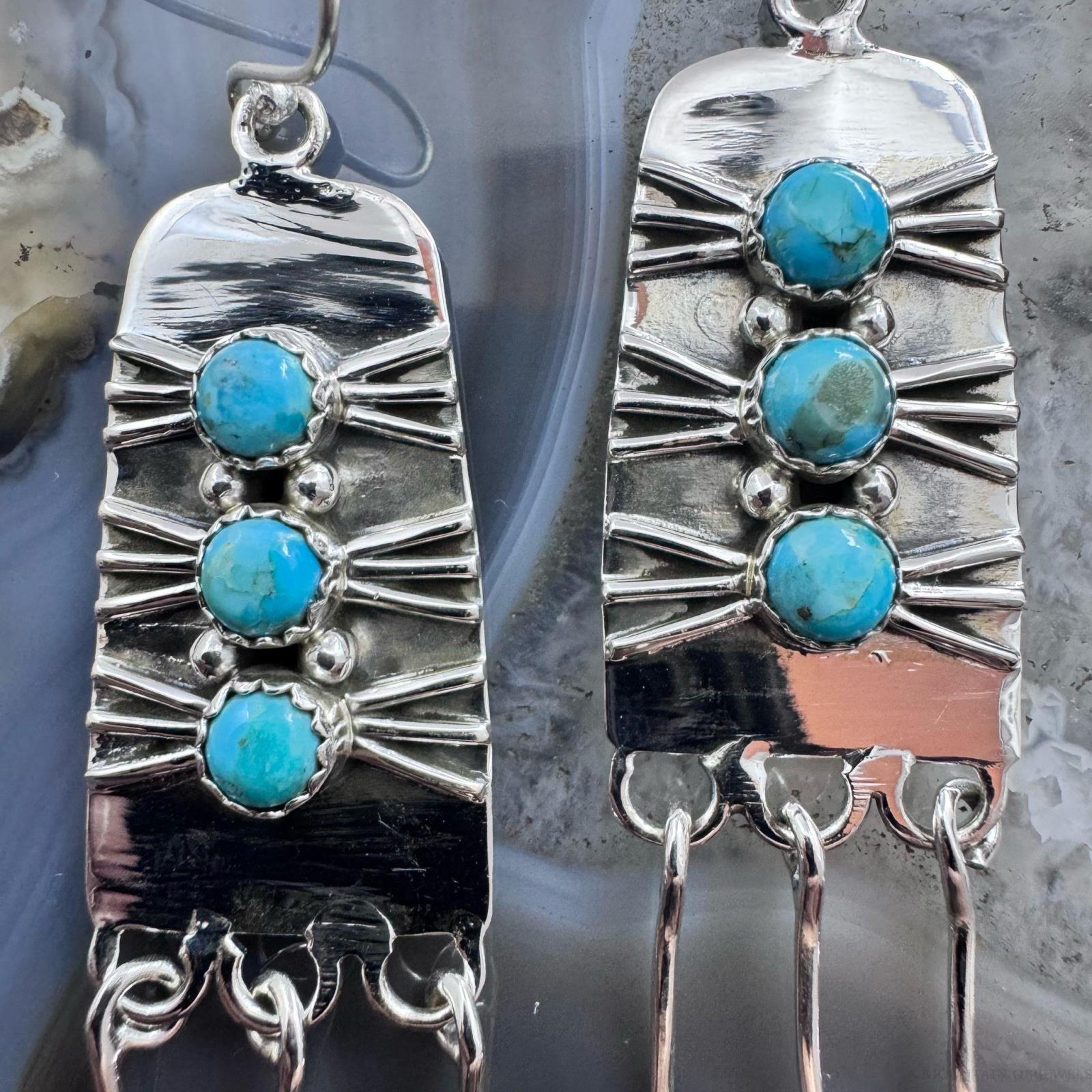 Sterling Silver Southwestern Style 3 Rounded Turquoise Tassel Dangle Earrings For Women.