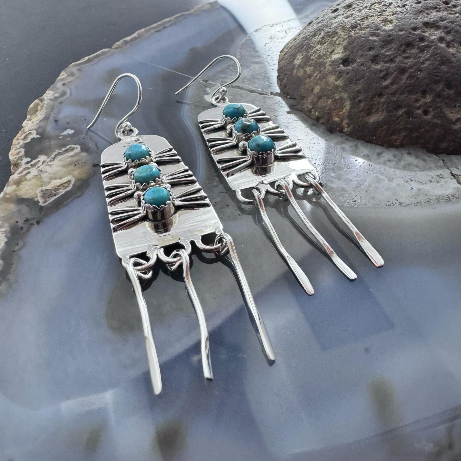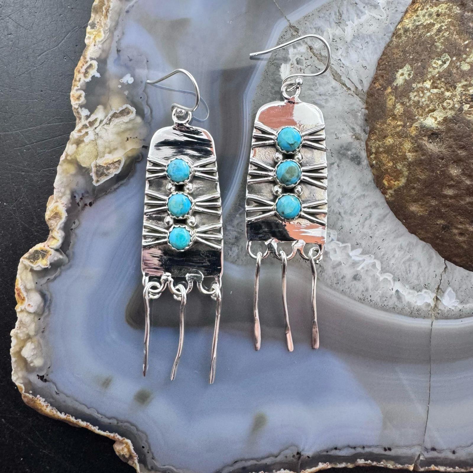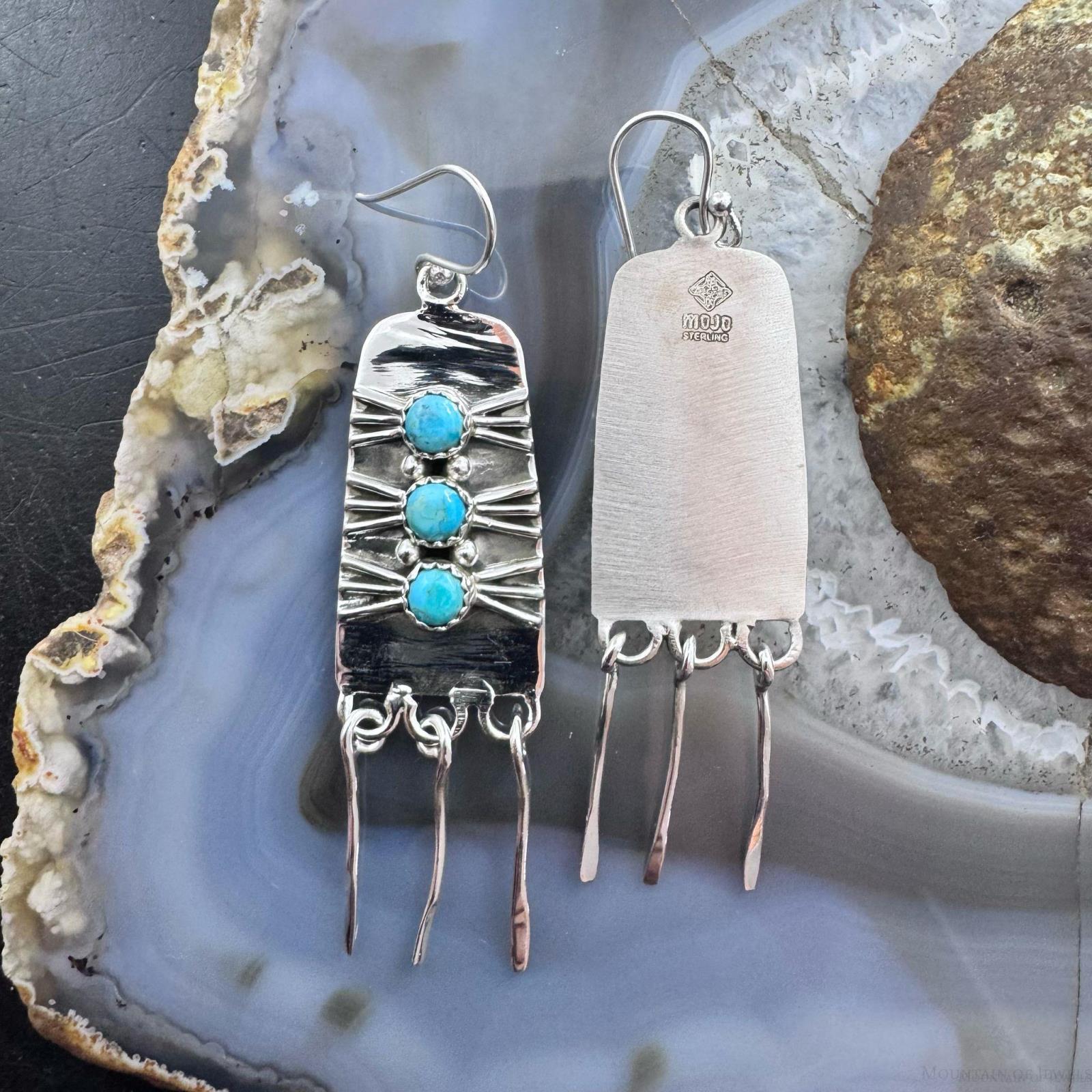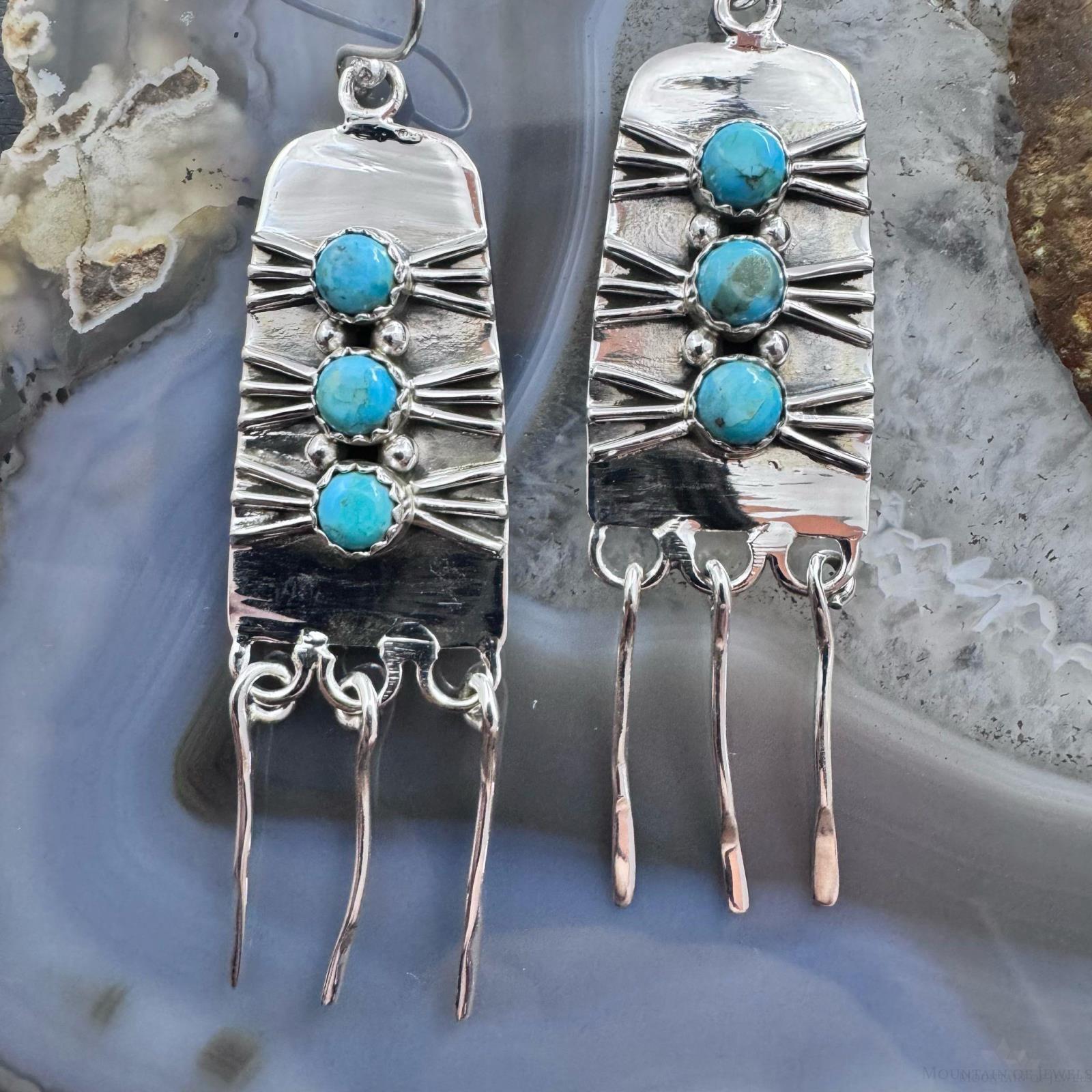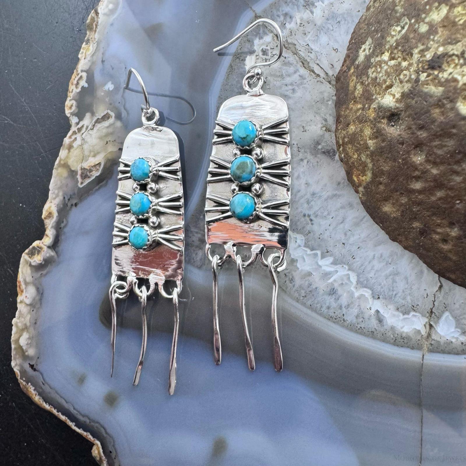 Sterling Silver Southwestern Style 3 Rounded Turquoise Tassel Dangle Earrings For Women.