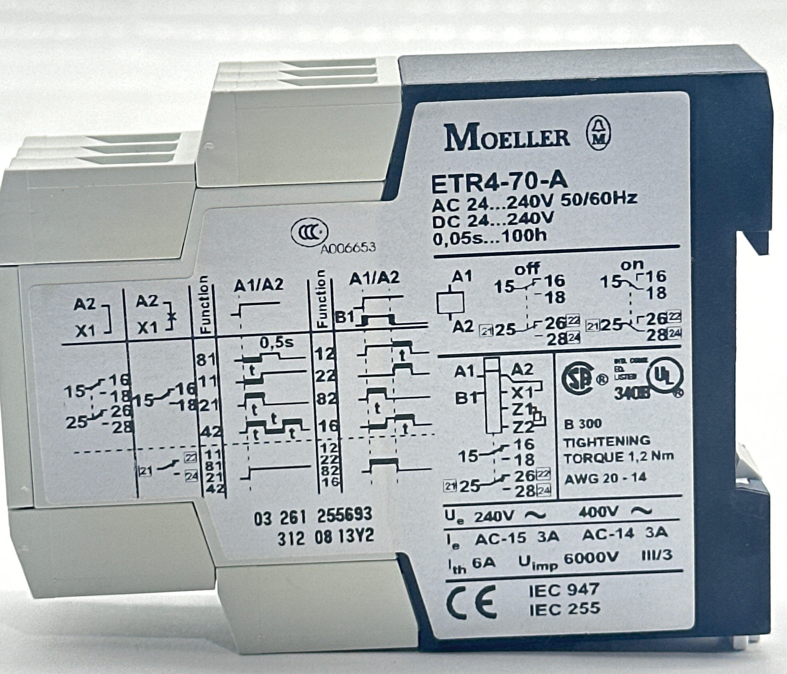 The ETR4-70-A is a multifunction electronic timing relay from Moeller (now Eaton), designed for automation systems requiring precise timing functions. It offers a wide timing range and supports both AC and DC control voltages.