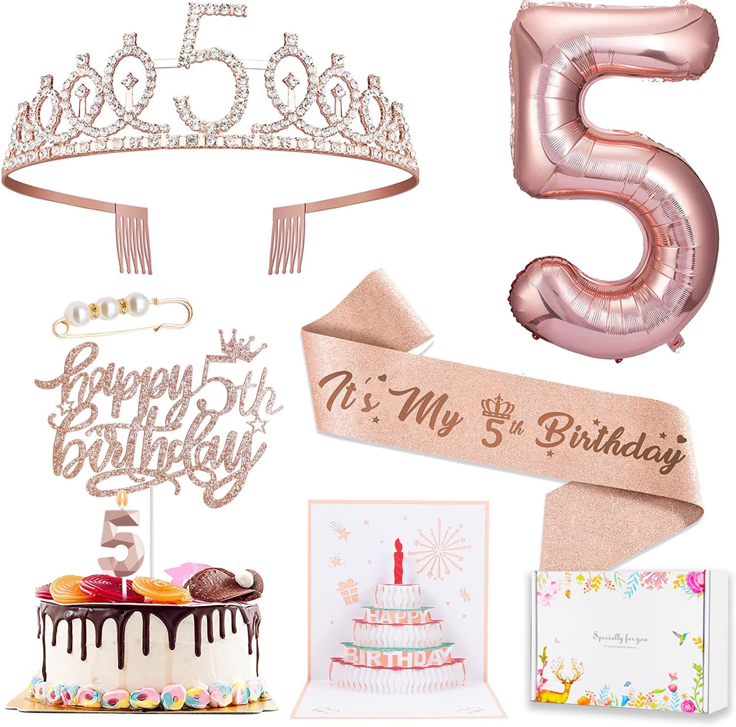 5th Birthday Decorations for Girl: Glittery 5th tiara/crown *1pc, “It’s my 5th birthday” sash *1pc, Happy 5th birthday cake topper *1pc, pearl pin*1pc, Number 5 candle *1pc, Number 5 balloon *1pc, they are exquisitely packaged in the carton.