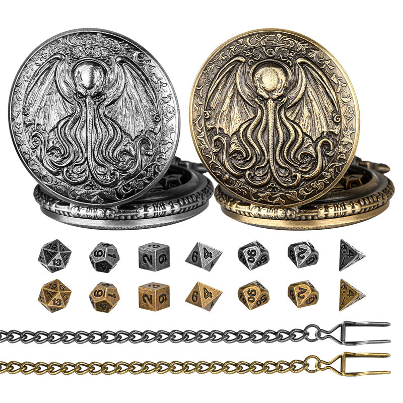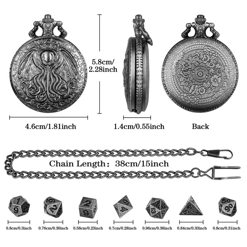 Product Features: 100% Brand New and High Quality. Case Diameter: About 4.6cm Case Thickness: About 1.4cm Total Length of Chain: About 38cm Package Content: 1 x Pocket Watch Case 1 x Chain 7 x Dices