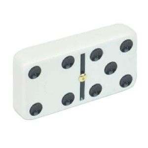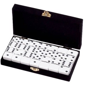 One Double Six Set of Dominoes (28 Tiles with Spinners) in White with Black spots. Tournament Jumbo Size (2" X 1" X 1/2"). Comes in an Elegant Black Velvet Box.