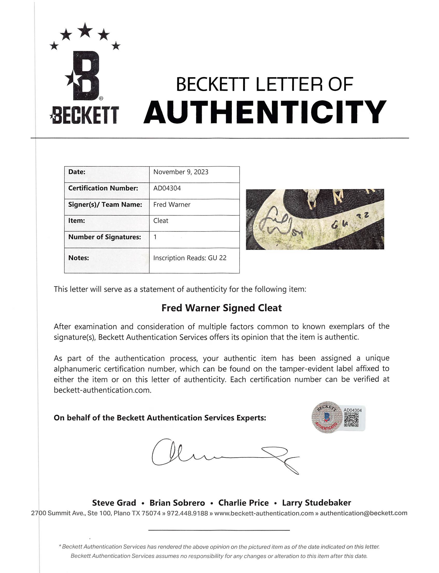 This Autographed Game Worn Size 12 Nike Alpha Menace Cleats with the inscription of "GU 22" has been Personally Signed by Fred Warner of the San Francisco 49ers. This item is 100% Authentic to include a Certificate of Authenticity (COA) / hologram by Beckett Authentication Services. The authenticity can be verified on Beckett Authentication Services website.