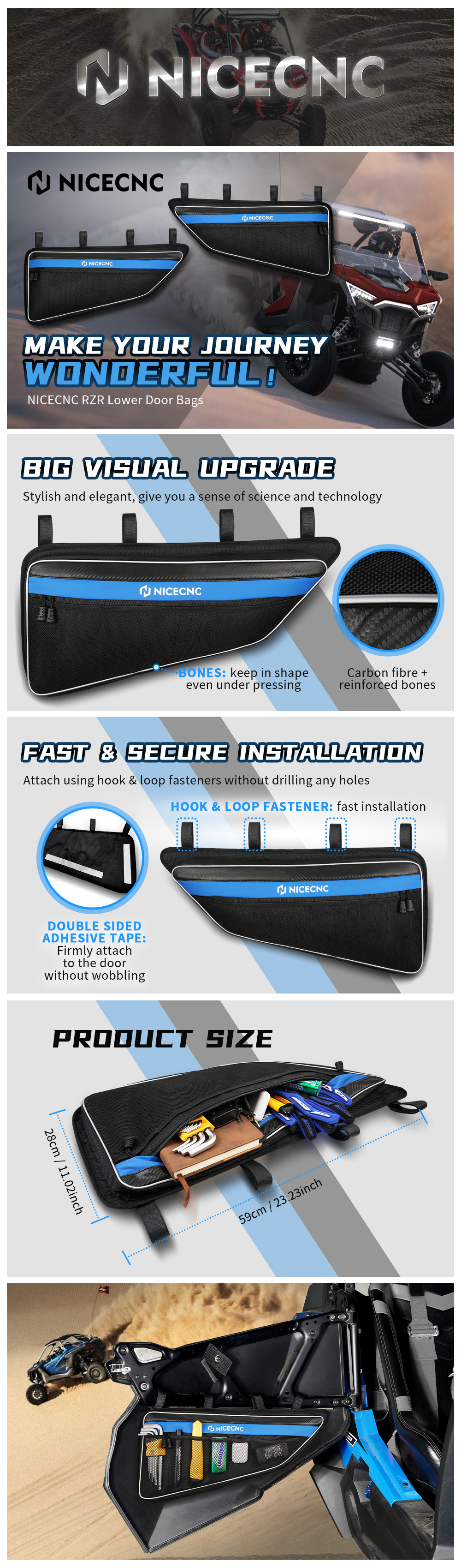 【Perfect Fitment】NICECNC RZR lower door bags designed to meet different needs, it can be perfectly compatible with OEM or modified door panels. No getting in way if you have upper door speaker, to make you best journey.(Please see the following compatibility list for more fitment)