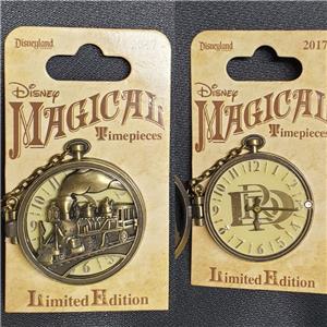 Second of a bi-monthly series released exclusively at Disneyland Resort. A antique brass cut out of the Disneyland Railroad engine chugging across a bridge with its smokestack going full steam ahead! The Railroad engine on the cover opens to reveal a classic pocket watch clock face and a classic Disneyland "D". The pin is designed to look like a pocket watch with a round crown at the top attached to a watch chain the ends at the hinge. The black hands move around the watch. All metal, antique brass, hinged. The back of the pin has the traditional Mickey waffle pattern. Backstamps consist of a square 2017 pin trading logo, rectangular ©Disney Made in China copyright, rectangular edition size, and rectangular factory number.