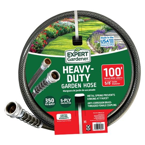 5/8 inch diameter x 100 foot length Expert Gardener® Heavy-Duty garden hose features a Comfort Grip connector that protects the hose coupling from becoming damaged, while also making it easier to connect and disconnect the hose from any faucet or spigot. The hose features nylon reinforcements and an ergonomic gripper makes it suitable for all ages to use. This flexible garden hose has a five-ply construction, high 350 PSI burst strenth, and the hose guard flexes to allow for ease of movement during use. It's ideal for use in just about any residential yard and can be used to water the lawn, garden, or landscaping, as well as for washing the car or siding on the home, and much more.