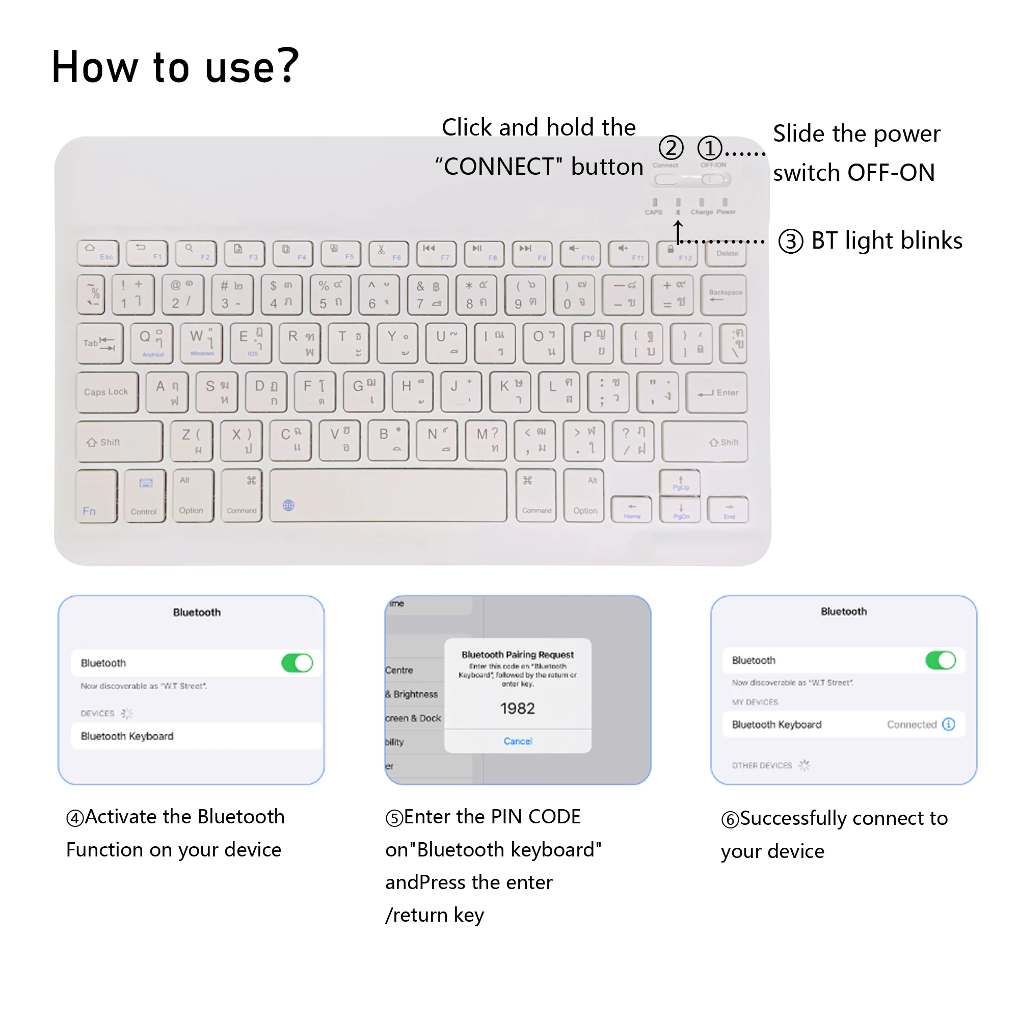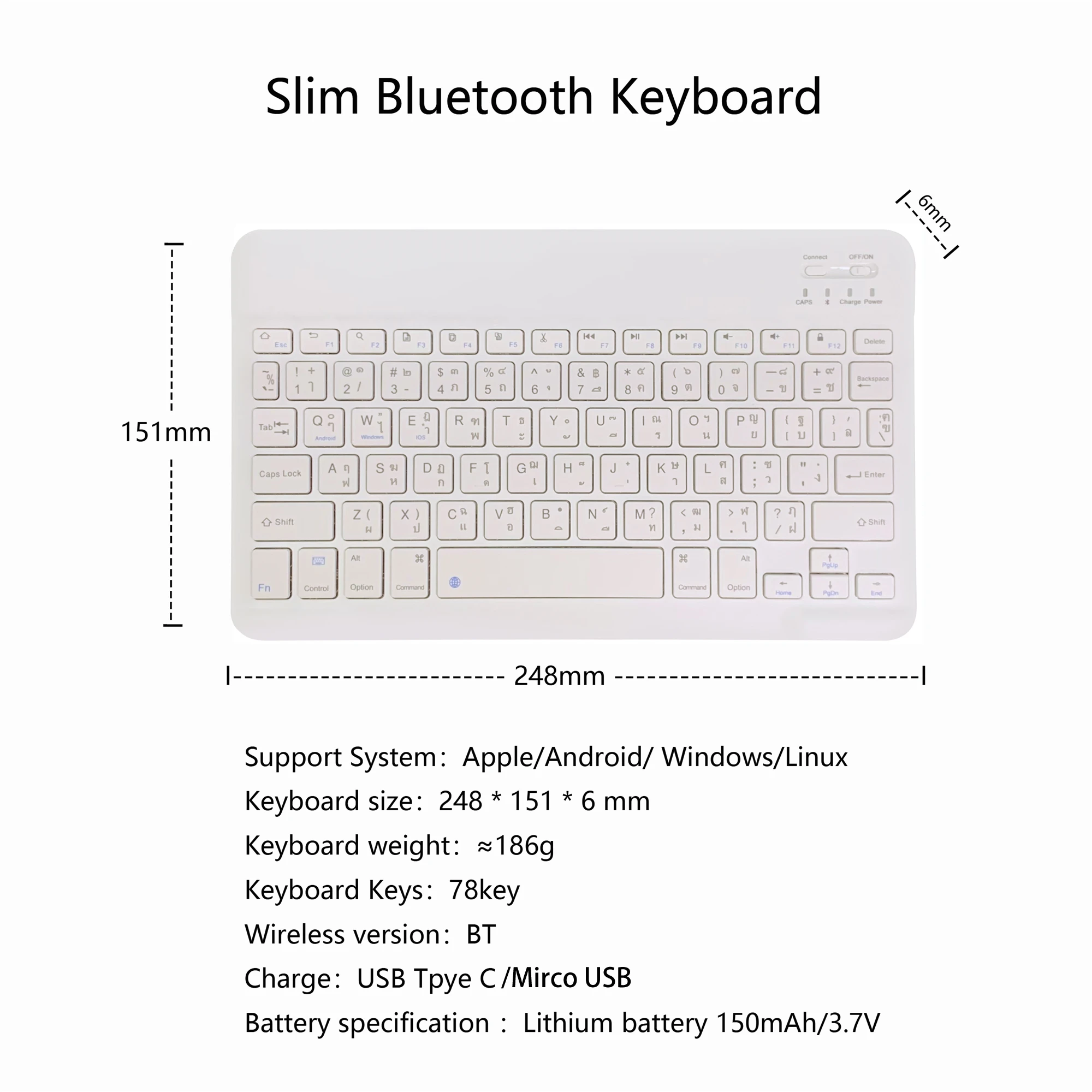 Ultra-Thin 78 Keys Thai Language Bluetooth Keyboard | Rechargeable Silent Multi-Device w/Hot Keys for Android iOS Windows