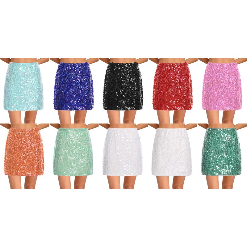 Crafted from a blend of polyester, nylon, sequins, and spandex, this skirt offers stretch, durability, and a touch of sparkle, ensuring a comfortable and eye-catching fit.