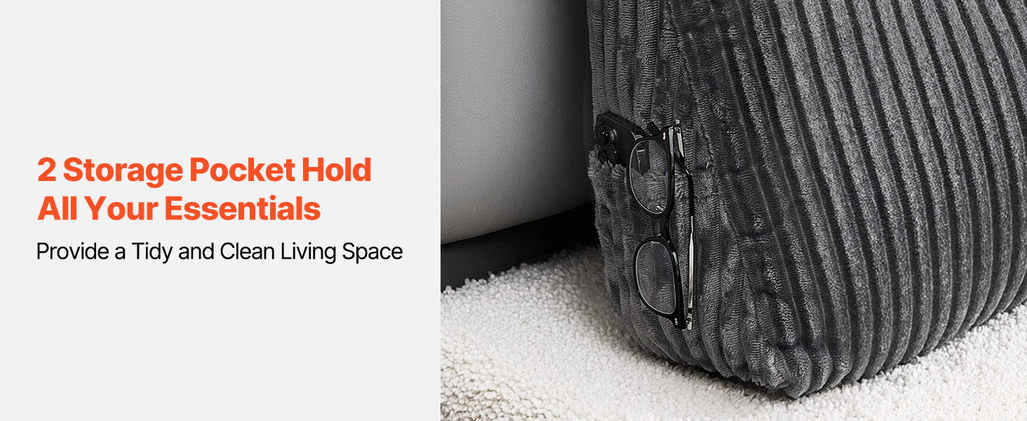 Gardez votre espace bien rangé grâce à deux poches de rangement pratiques conçues pour ranger vos essentiels (télécommande, téléphone et magazines). Profitez d'un espace de vie ordonné et serein, sans le chaos.