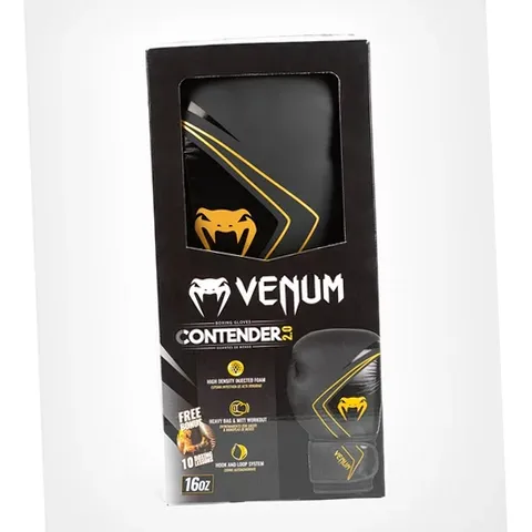 With a modern design, the Venum Unisex Contender 2.0 Boxing Gloves - Black/Gold- 12 oz - Adult (12+) offer the perfect combination of compactness and practicality. Ideal for strike training (bag work, mitt work, fitness boxing) With new injection padding, and a better finish, the Contender 2.0 gloves will give you self-confidence to increase your performances. The Venum Contender 2.0 boxing gloves have a multi-density foam padding and a wide strap for enclosure ensuring a secure fit and providing protection to minimize the risk of injury during your training.