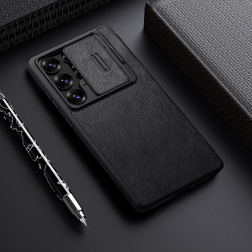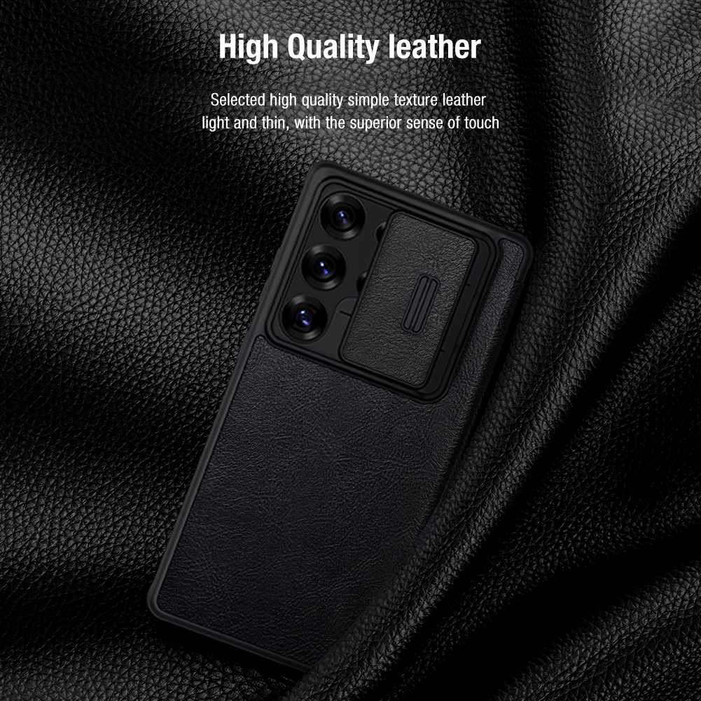 Qin leather case uses superior natural texture leather bringing the case superior sense of touch, created a new noble and baron style. Patented lens sliding cover design, protect the camera lens, anti-scratch and protect your privacy. Soft delicate lining, anti-skid and dirt-proof, fashion and useful. Classic flip Leather cover designed that give your cell phone 360°protection. Customized insides slot for you to place your card convenient. The Unique details design of the slot, nickel screen, LOGO shows the elite style.
