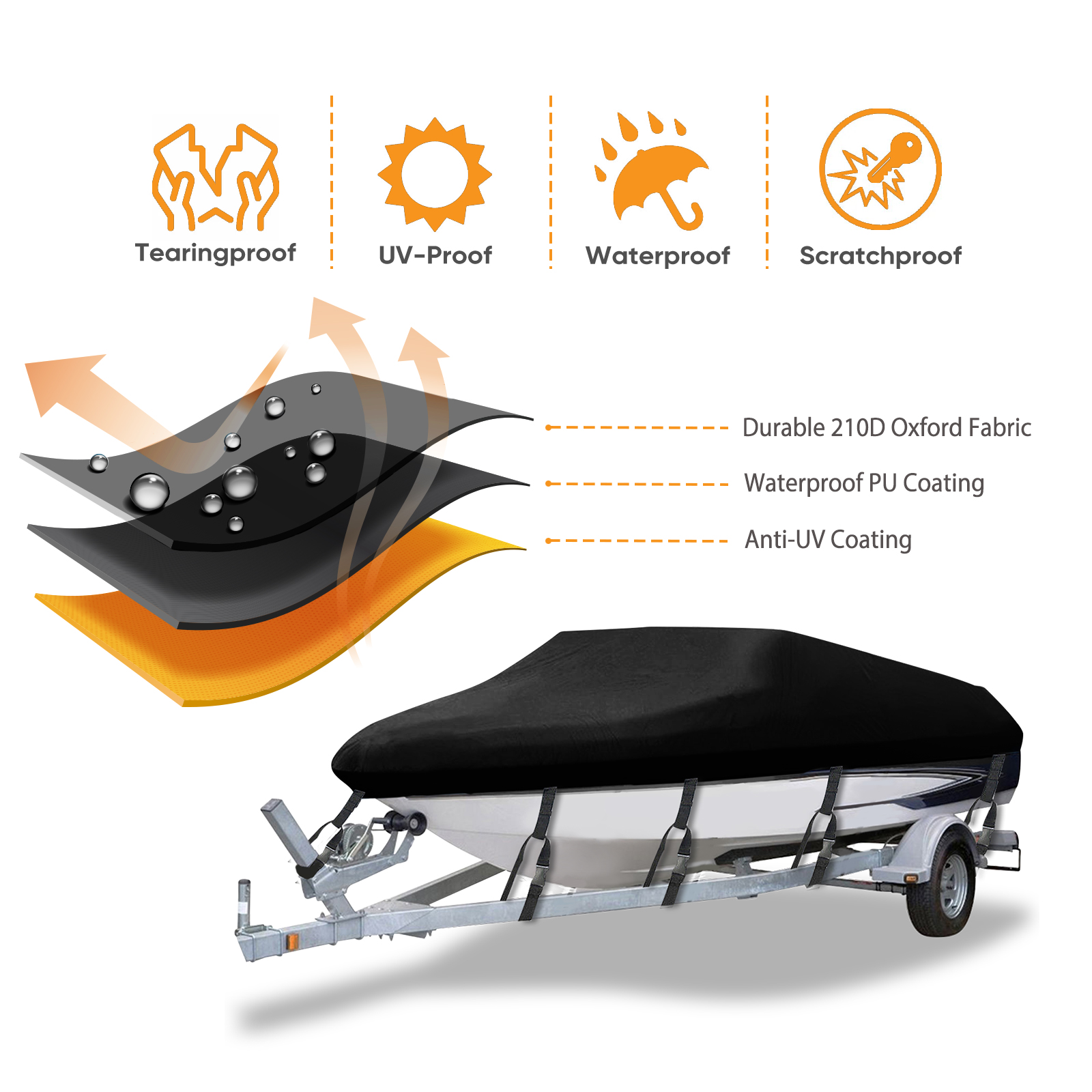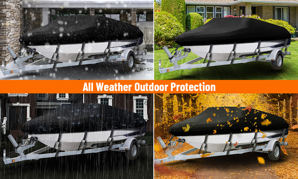 【Material】 --- Made of 210D oxford fabric material. Trailerable boat cover made of durable marine grade oxford fabric with water-resistant PVC coating and anti-UV finish. Bass boat cover will protect your boat perfectly from the sun, wind, dust, and bad weather, and keep your boat always in good condition.
