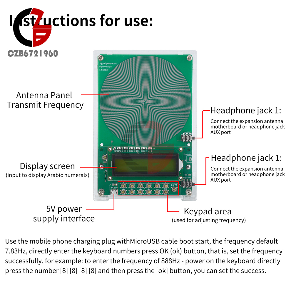 Usage: use the phone charging plug with Android cable boot start, the frequency default 7.83Hz, directly enter the keyboard number press OK (ok) button, that is, set the frequency successfully, for example: to enter the frequency of 888Hz - power on the keyboard directly press the number [8] [8] [8] [8] and then press the [ok] button, you can set the success.