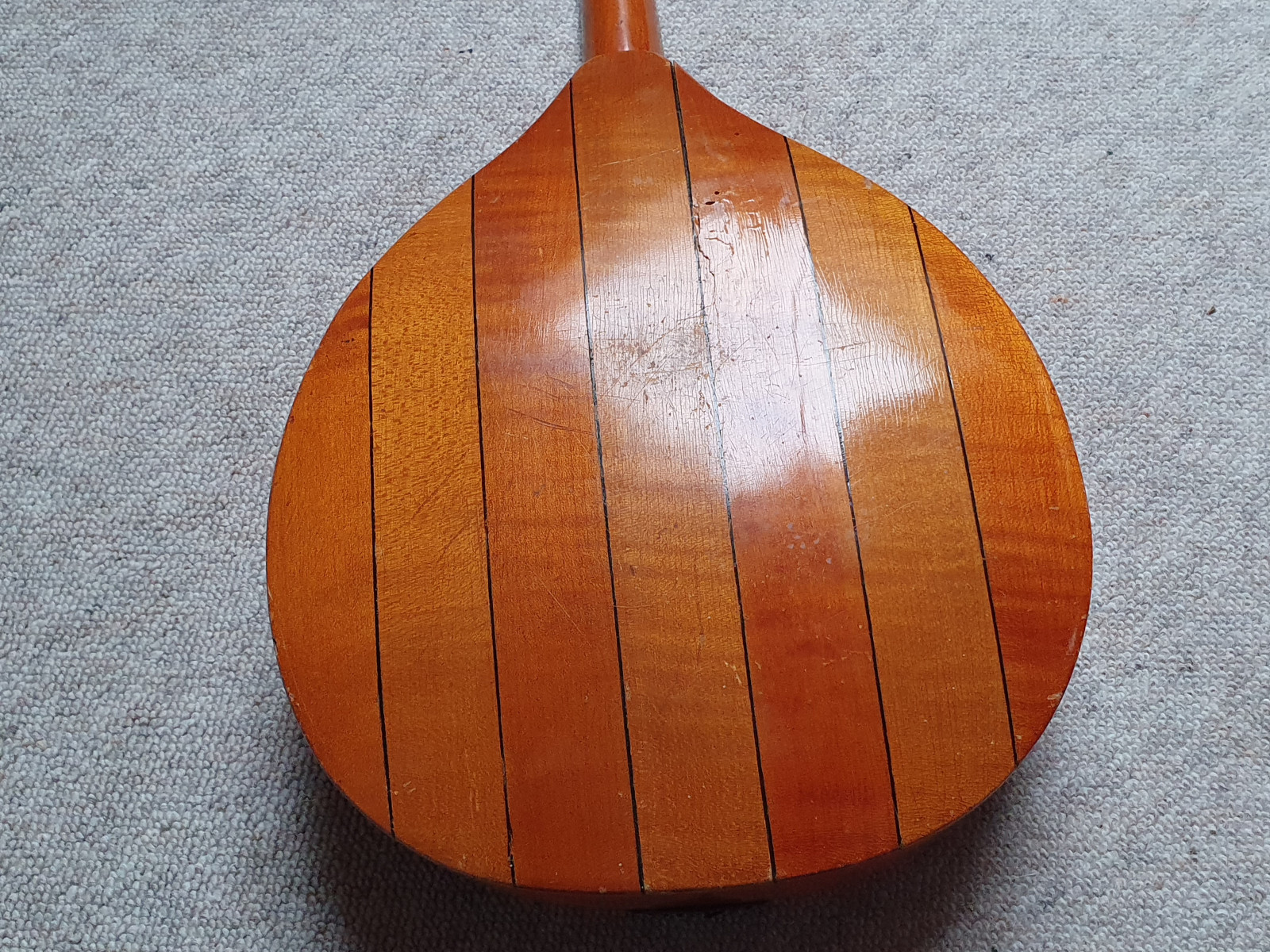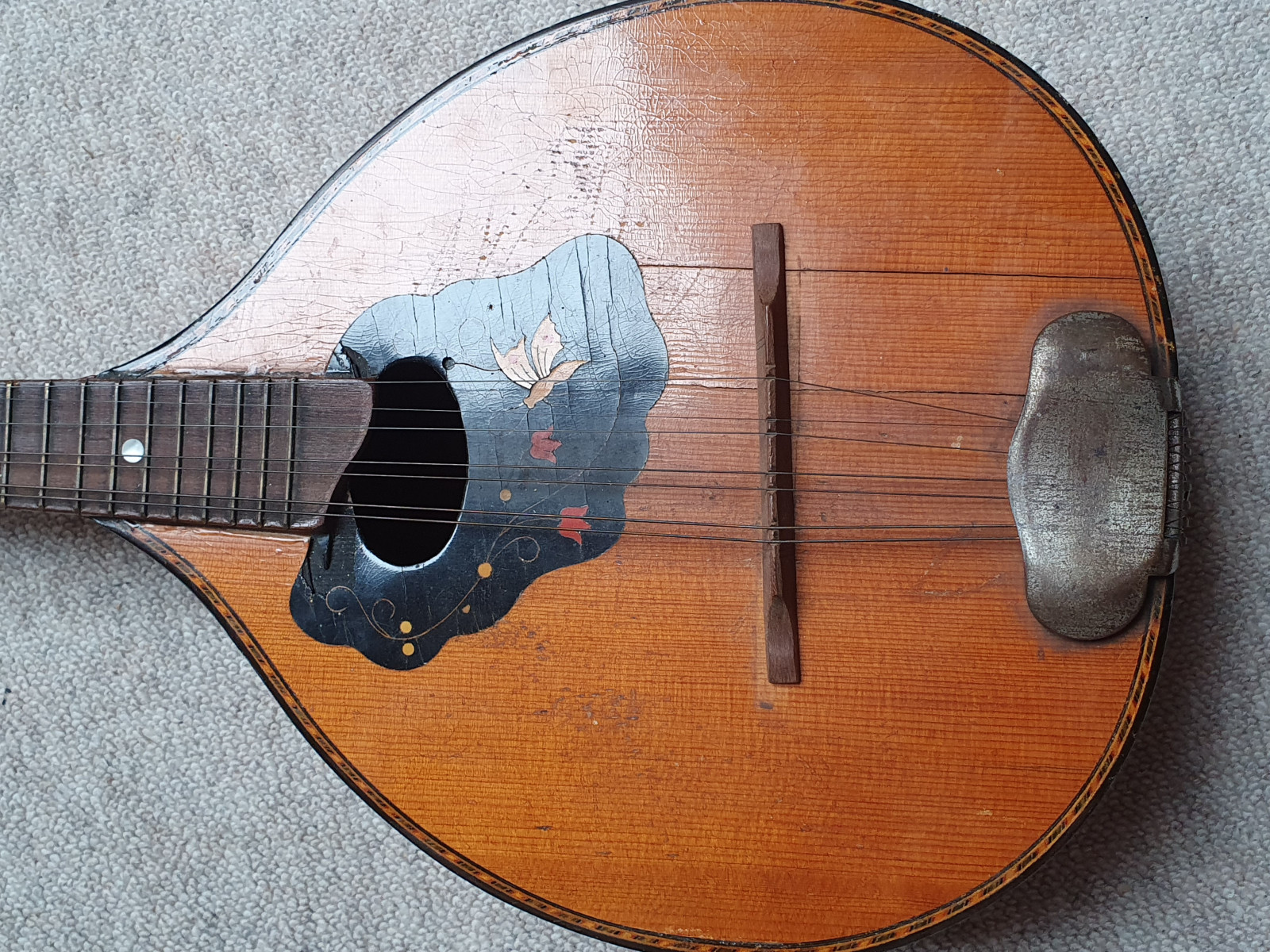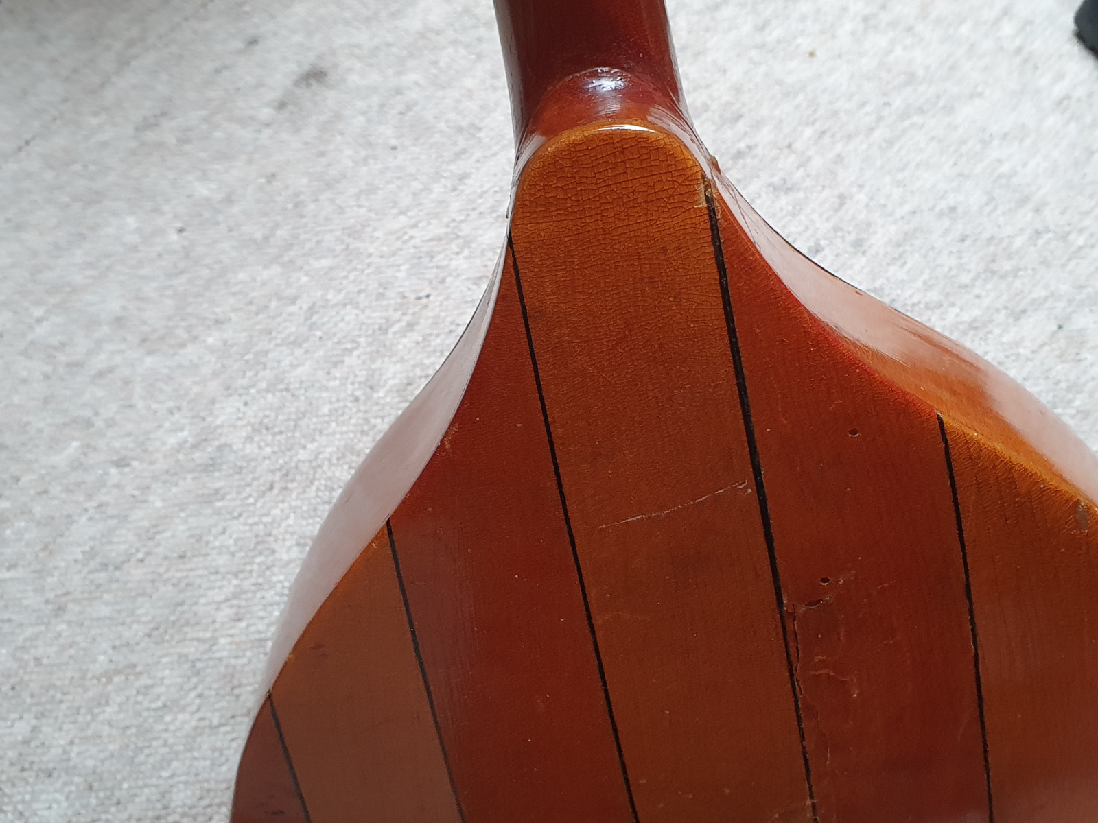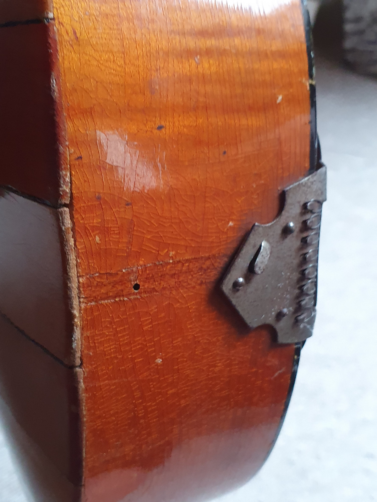 Old mandolin . There are cracks at the front and several damages all arrond the instrument. Please make sure that you see all the photos UNDER this text.. The length is approx60,5cm/23 3/4 inch. Length of the body is 12 1/4inches/ 31,5cm. The sounding length is aprox. 13 3/8inch / 34 cm. Please make sure that you see all the photos UNDER the item describtion! Instrument may needs serious repair, service and cleaning . If you have any questions, please ask. Insured shipping to USA or Canada amounts to $ 59. I will ship worldwide. Shipping several items saves shippingfees.