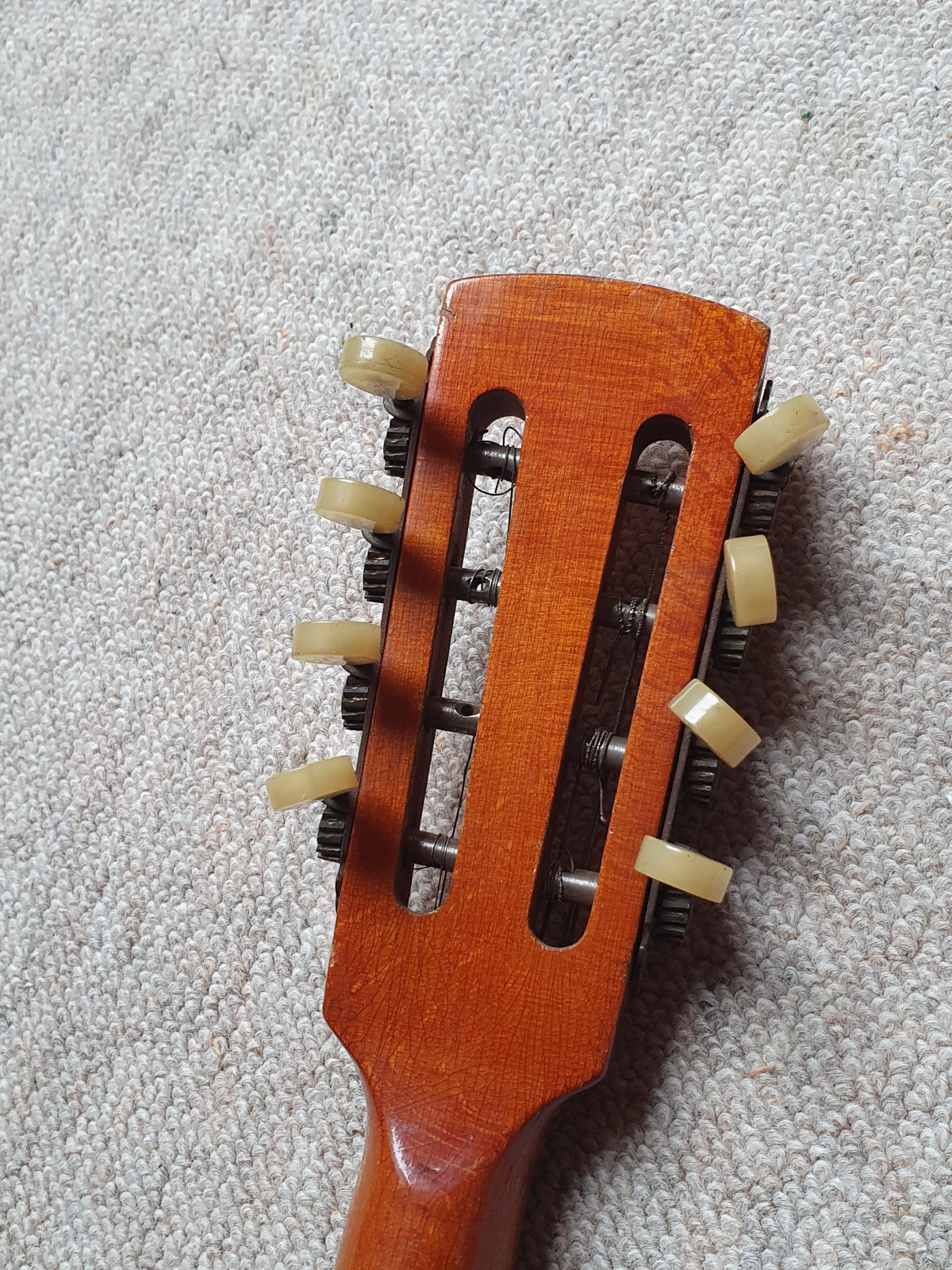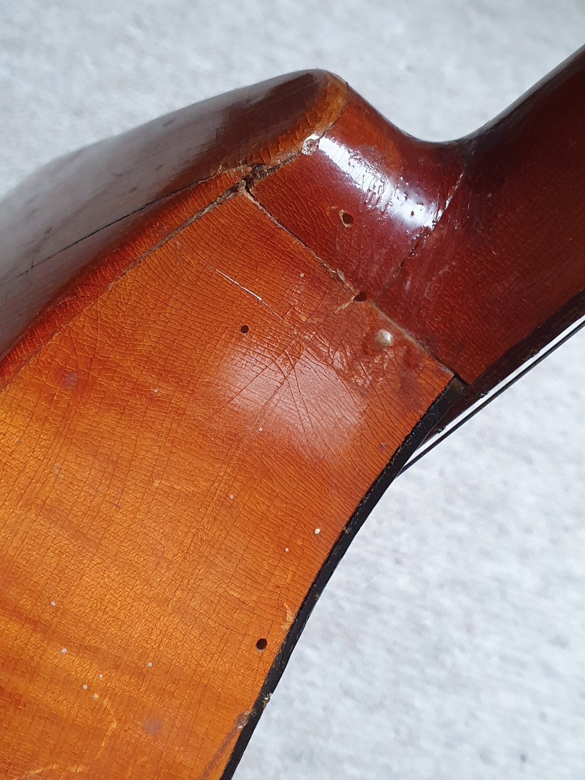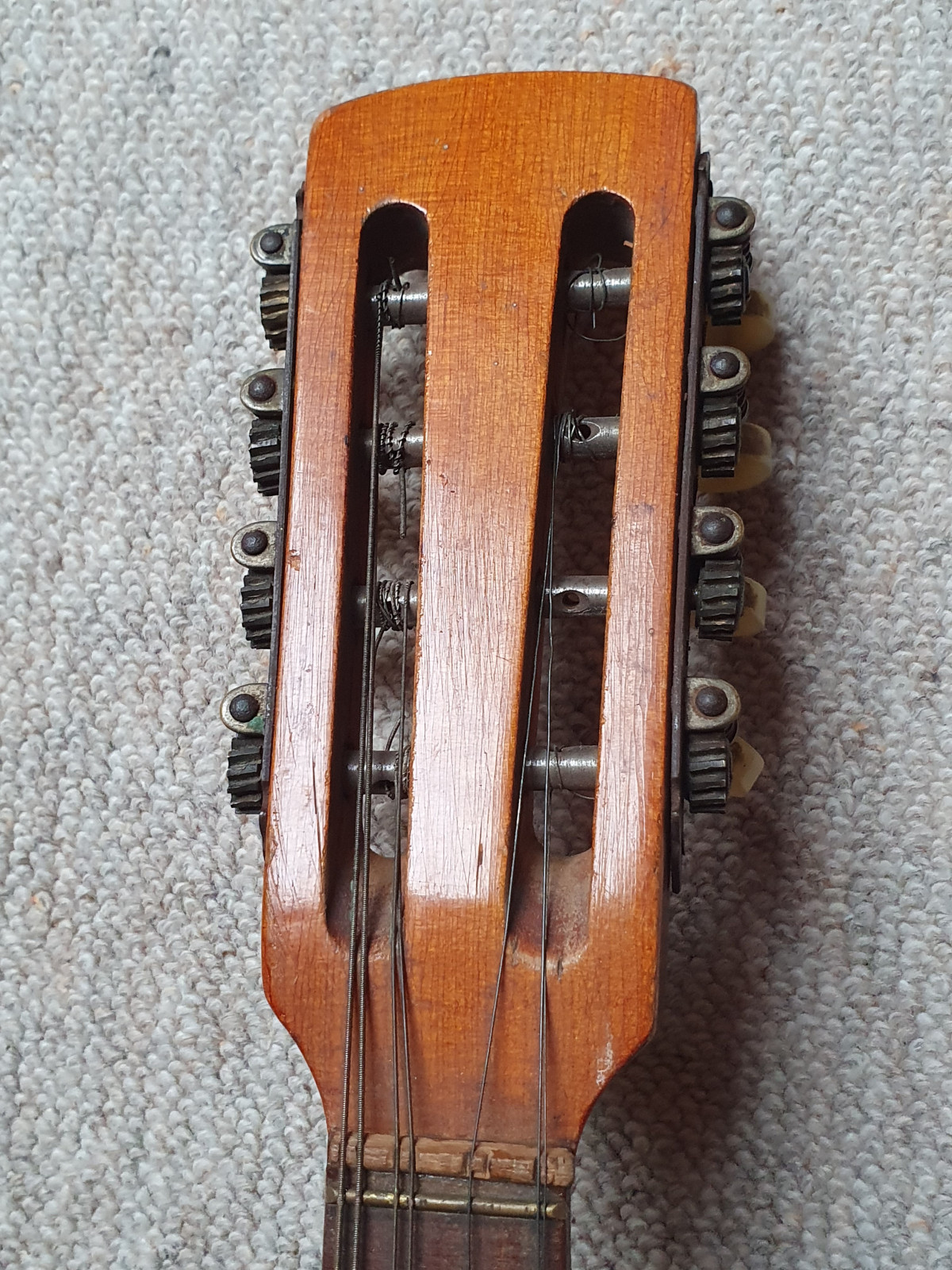 Old mandolin . There are cracks at the front and several damages all arrond the instrument. Please make sure that you see all the photos UNDER this text.. The length is approx60,5cm/23 3/4 inch. Length of the body is 12 1/4inches/ 31,5cm. The sounding length is aprox. 13 3/8inch / 34 cm. Please make sure that you see all the photos UNDER the item describtion! Instrument may needs serious repair, service and cleaning . If you have any questions, please ask. Insured shipping to USA or Canada amounts to $ 59. I will ship worldwide. Shipping several items saves shippingfees.