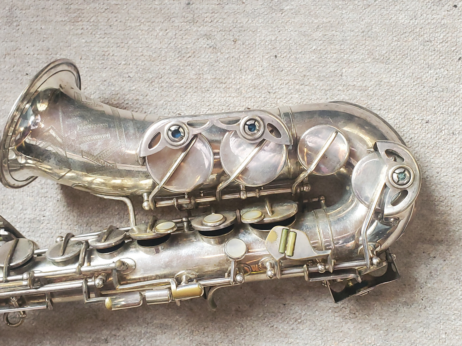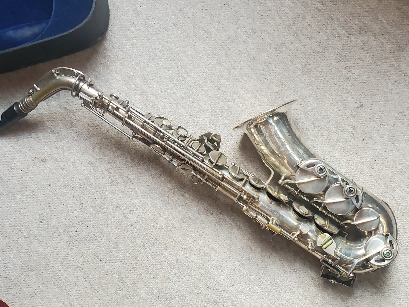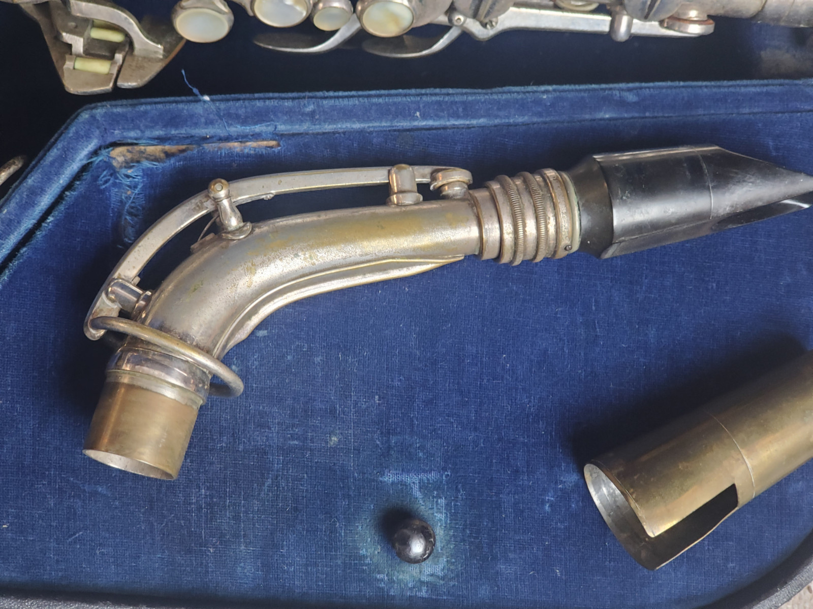 Interesting , nice and old Alto saxophone. The bell reads:" KING " The back reads: " 13858 / JKG Trade Mark / Model 3" (Julius Keilwerth Graslitz). The instrument needs some service , adjustment and cleaning. There is a small dent next to the thumb rest It comes in a used case and a noname mouthpiece. Of course it will be packed very well for the transit. Please also view my other auctions for instruments. Postage to USA or Canada is 79 USD.