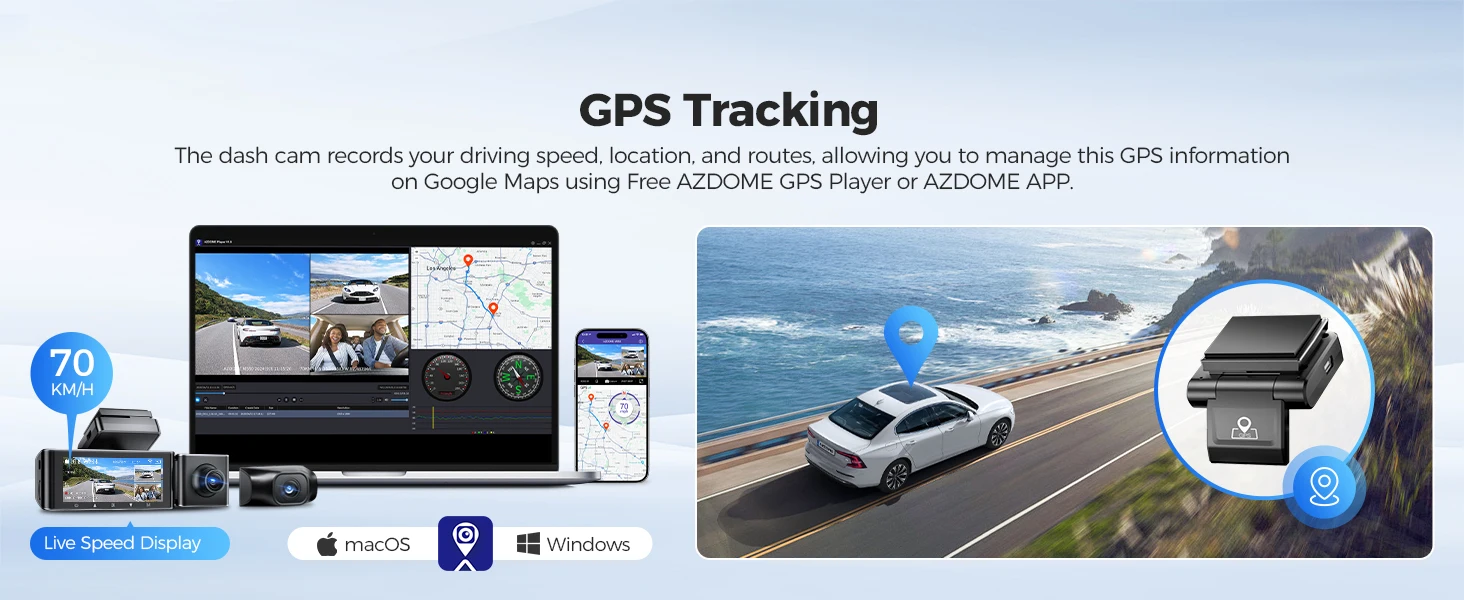 The AZDOME GPS Player allows users to view speed, route, latitude, and longitude of recorded videos. The M550 captures driving route data, providing crucial evidence during emergencies.