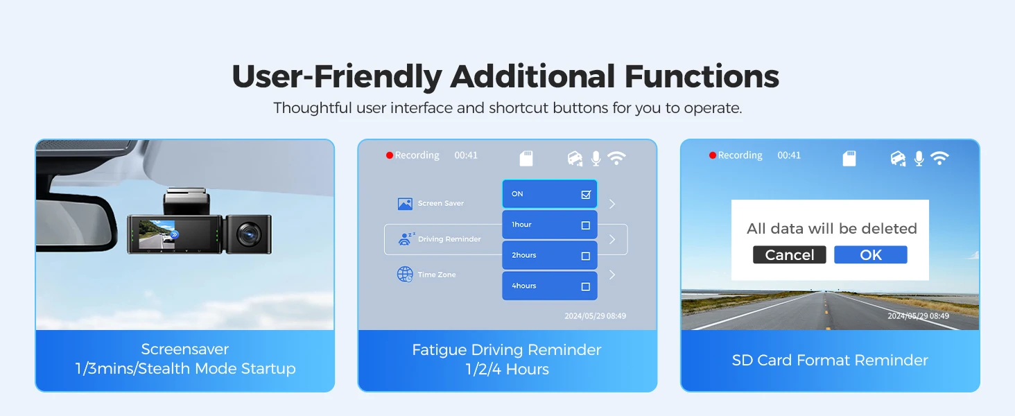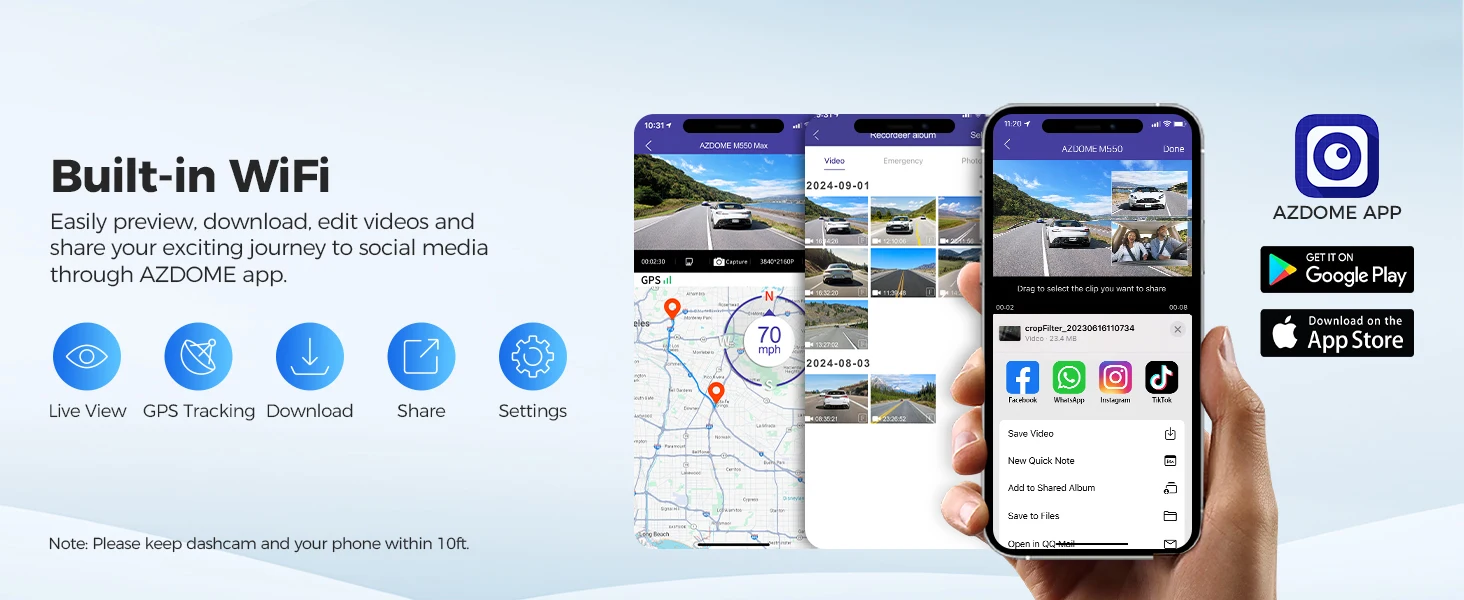 Connect to the AZDOME App on iOS or Android devices for video playback, download, and management. Share travel moments with friends and family effortlessly.