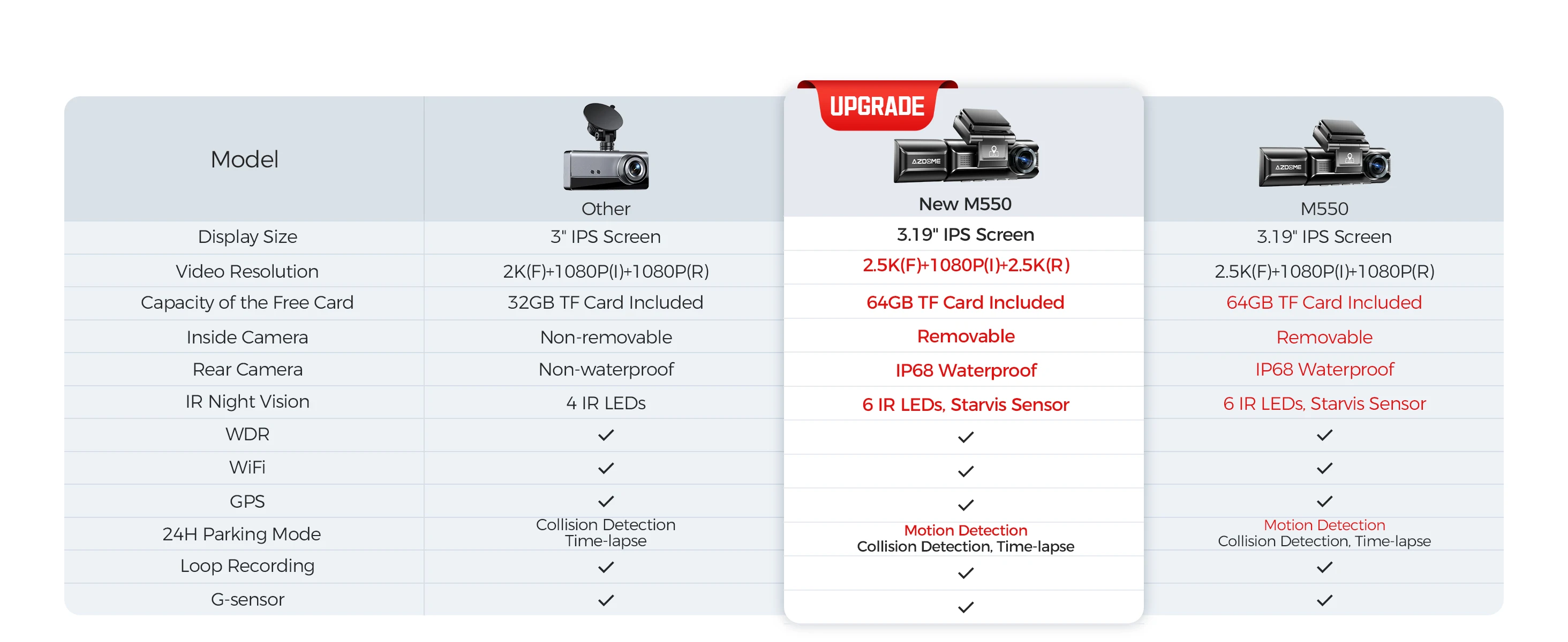 Equipped with the Novatek NT96670 Processor, GC4653, Sony IMX307, and GC2053 sensors, the M550 delivers superior night vision, ensuring clear recordings in both day and night environments.