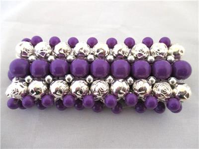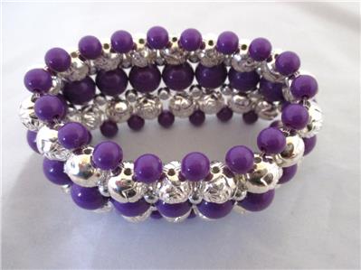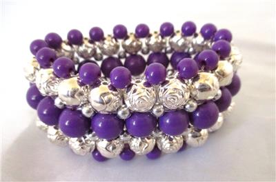 Wearing this pretty bracelet can add a pop of color to any outfi. Purple acrylic beads accented with silver metal beads. Made completeley from beads that were harvested from broken jewelry. These scrap materials were 'up-cycled' to create this charming piece.