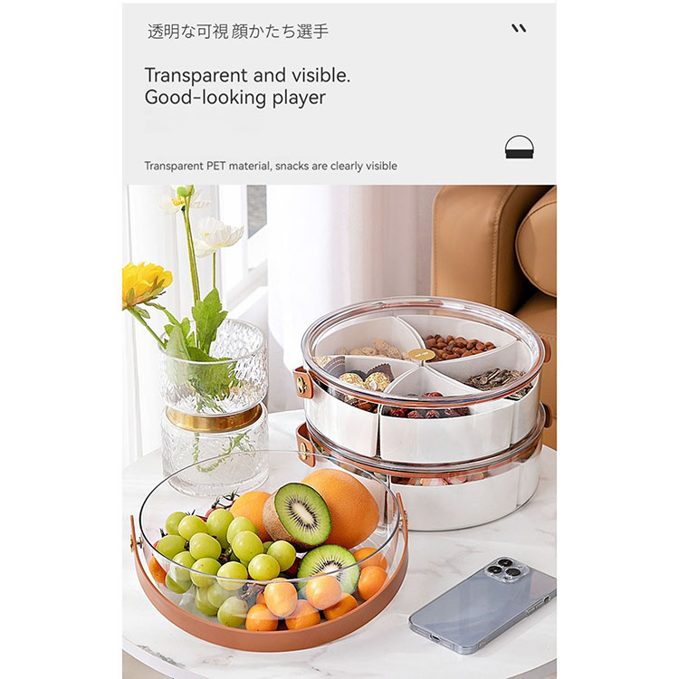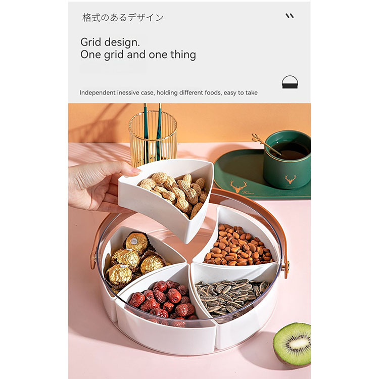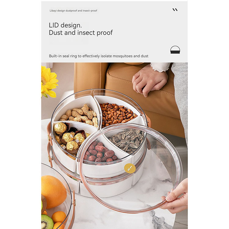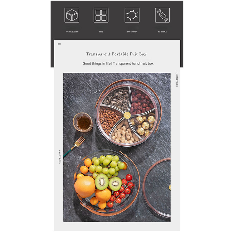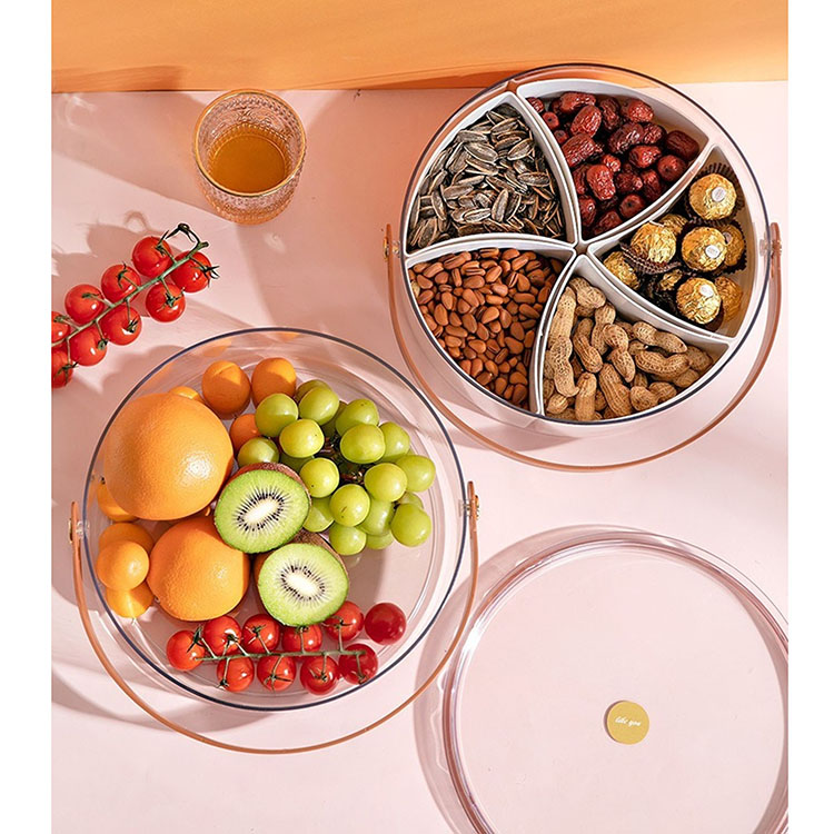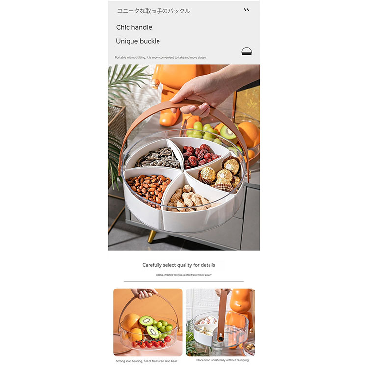 Includes 5 separate sections, removable dividers, the base can be used as a large food storage container, the tray has a handle, can be carried easily