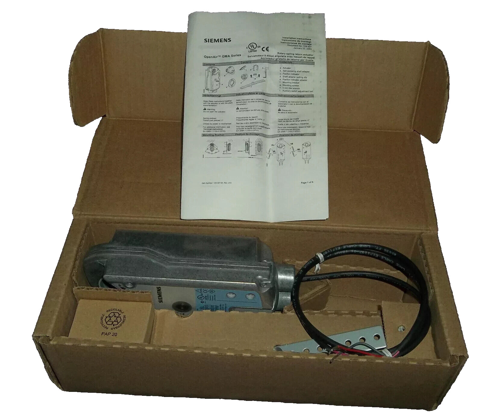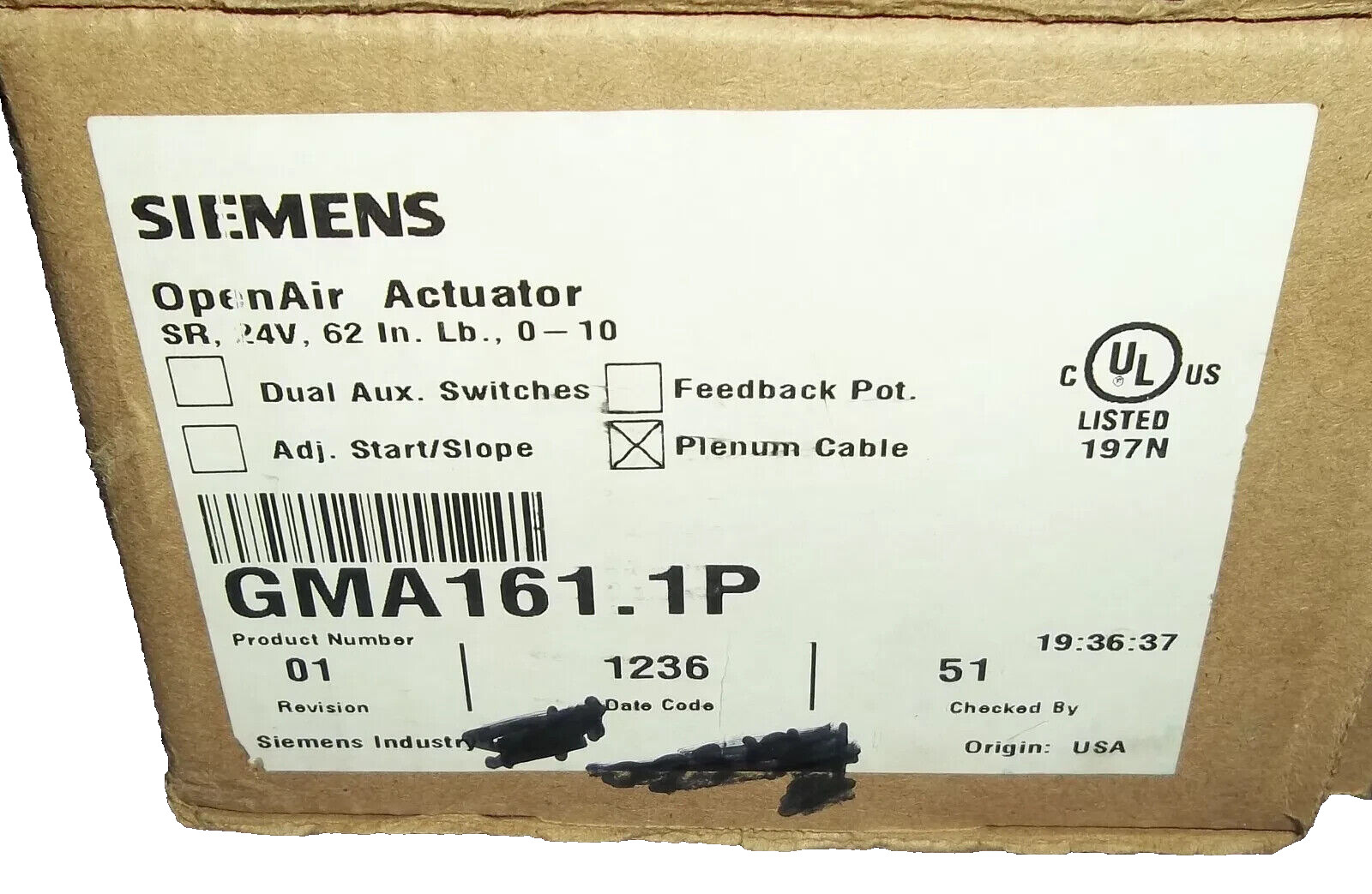 Siemens GMA161.1P Spring Return Electric Damper Actuator, Modulating, Plenum Cabling