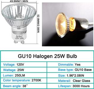- LONG LASTING LIFETIME: GU10+c 120v 25w, made of better tungsten filaments, average 3000 hours long lasting life, saving you the cost of frequent bulb replacement. Good dimming compatible, smooth dimming from 10-100%.