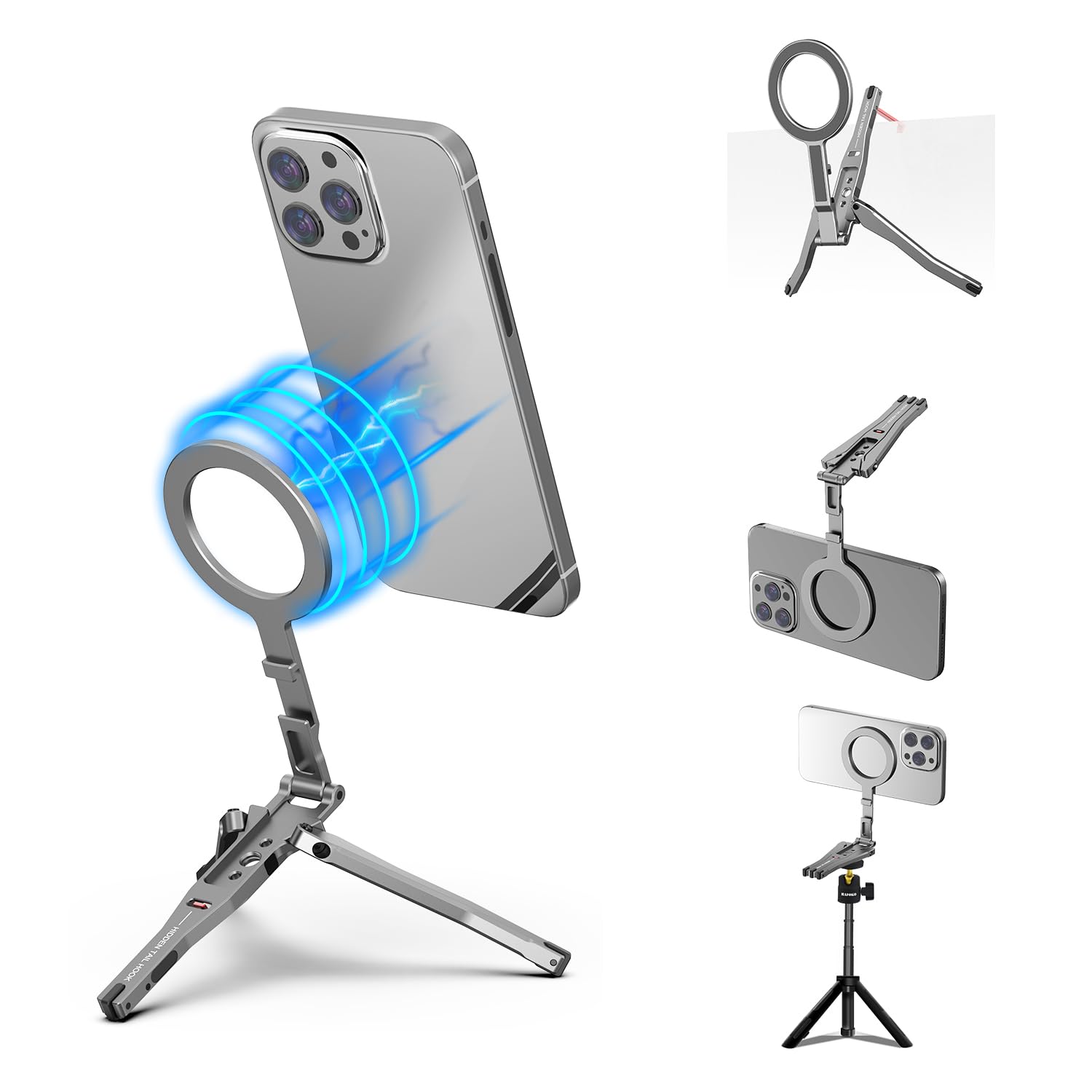 Magnétique Pochette Téléphone Trépied Aluminium Mini Bureau Pliable Magnétique Trépied Porté Main Compatible pour iPhone 16/15/14/13/12 Plus Pro Max, 1/4" Trépied Téléphone Léger Support Voyage