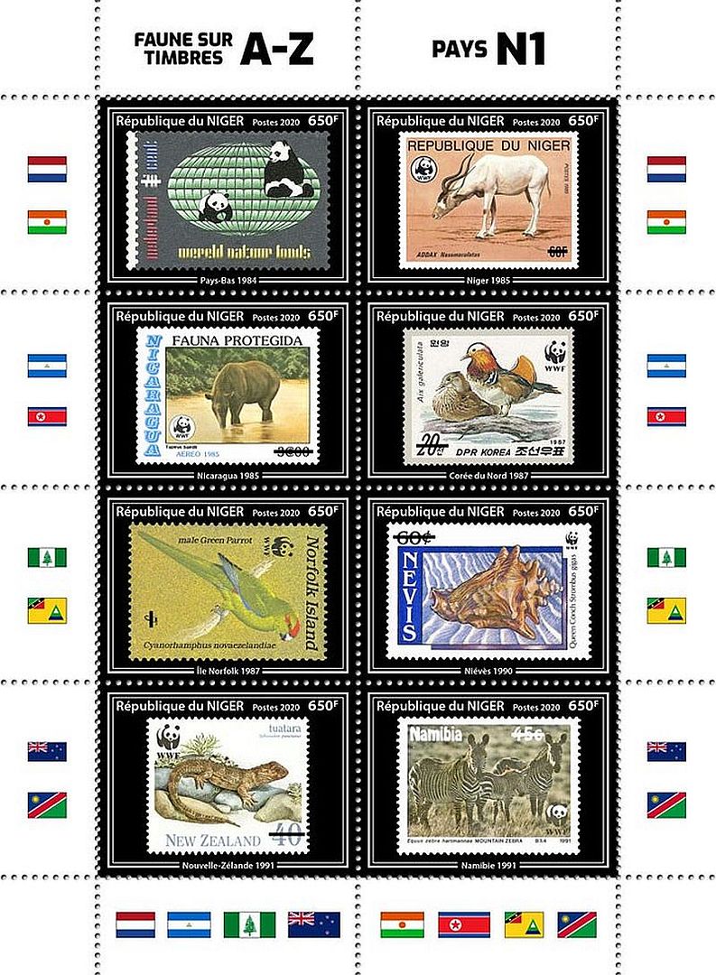Stamps on stamps featured include Netherlands, 1984; Niger, 1985; Nicaragua, 1985; North Korea, 1987; Norfolk Island, 1987; Nevis, 1990; New Zealand, 1991; and Namibia, 1991.