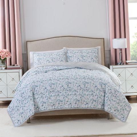 The Paris Hilton Camille King Quilt Set brings elegance and comfort to your bedroom with its stunning lilac floral design on textured microfiber fabric. This 3-piece set includes one king-sized quilt measuring 104" x 94" and two king shams sized 20" x 36", perfect for adults and teens seeking both style and coziness. Made from 100% polyester, the quilt set is luxuriously soft and cool to the touch, providing a restful sleep experience. Its reversible design adds versatility to your bedding decor, while the easy-care fabric ensures simple maintenance. Certified to meet Oeko-Tex Standard 100, this bedding set is free from harmful chemicals, prioritizing your health and safety. Elevate your bedroom ambiance with this beautifully crafted quilt set that combines fashion with function.