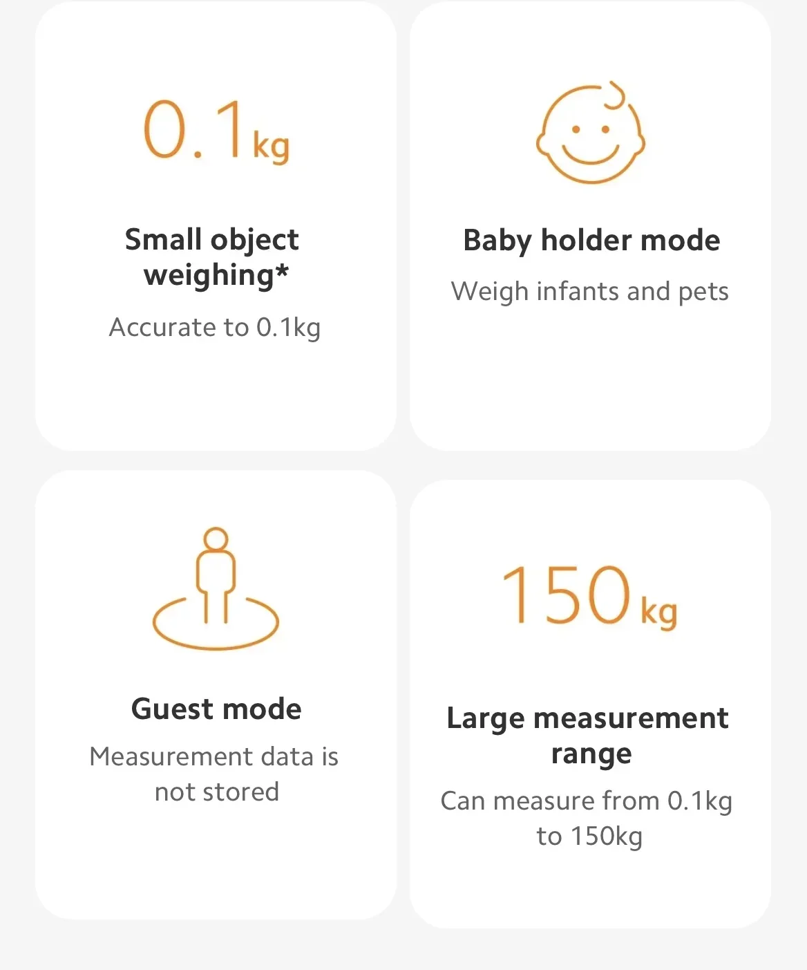 · Weights under 10kg will be judged as small object weights and will not be saved. If weighing infants is necessary, please use the 'Hold Baby Weighing' mode on the APP to save the infant's weight.